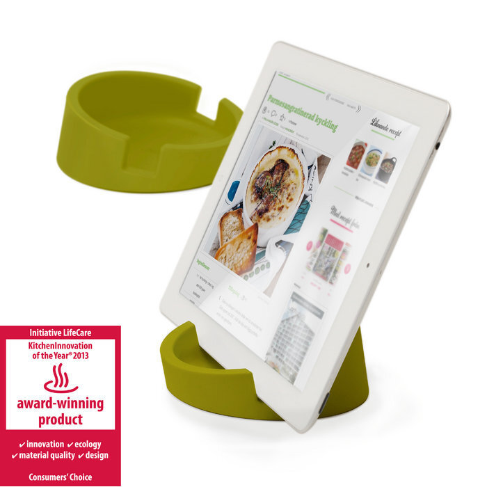Специальная подставка для современных поваров и просто любителей вкусно и весело готовить. Интересный дизайн был разработан специально для того чтобы вписаться в любой кухонный интерьер. Слушать музыку, смотреть видео, искать рецепт – все можно делать с одного устройства во время готовки. Планшет может располагаться как стоя, так и лежа, подходит как к стандартным моделям, так и к их мини-версиям. Полностью изготовленная из силикона подставка исключает любую возможность скольжения, а планшет надежно в ней зафиксирован.