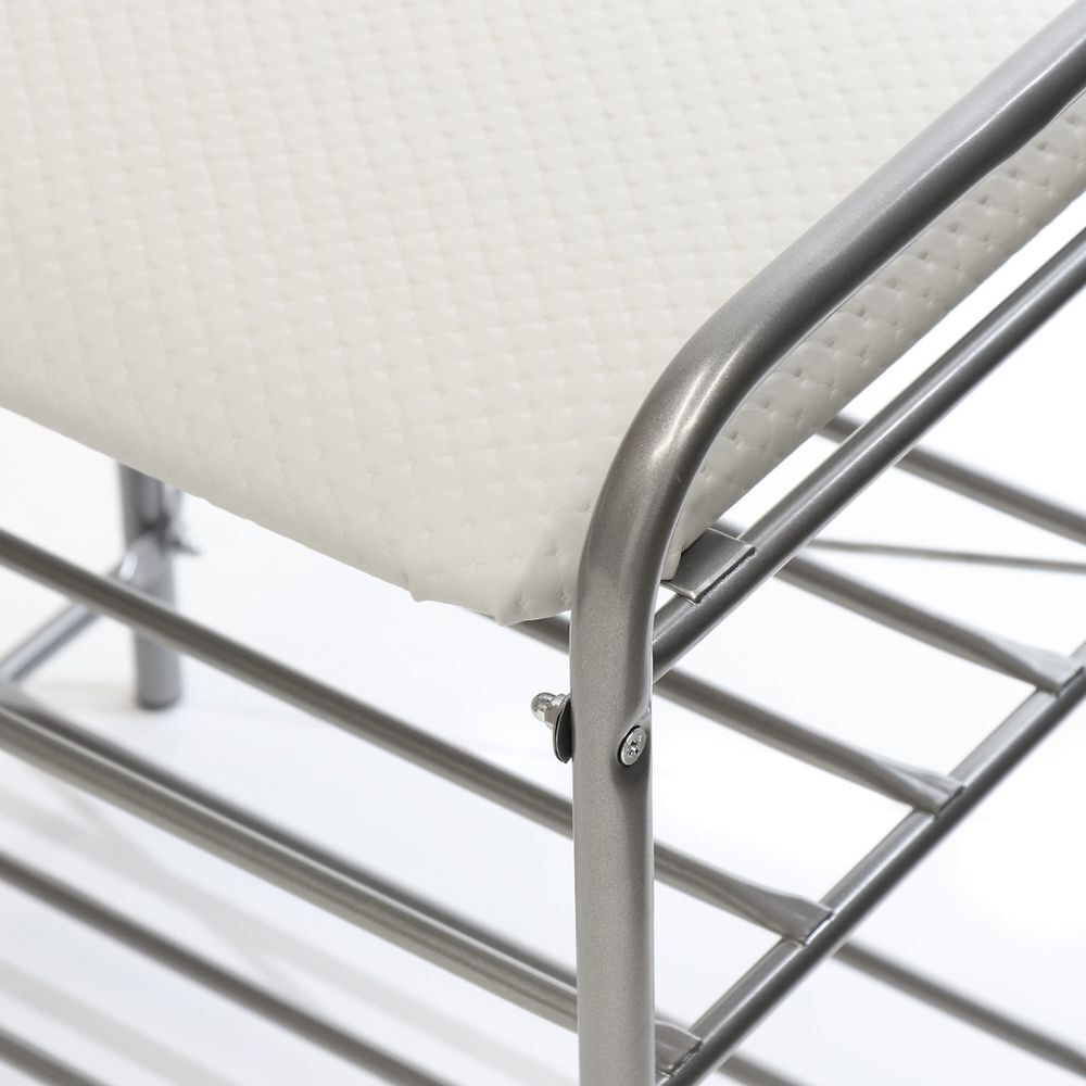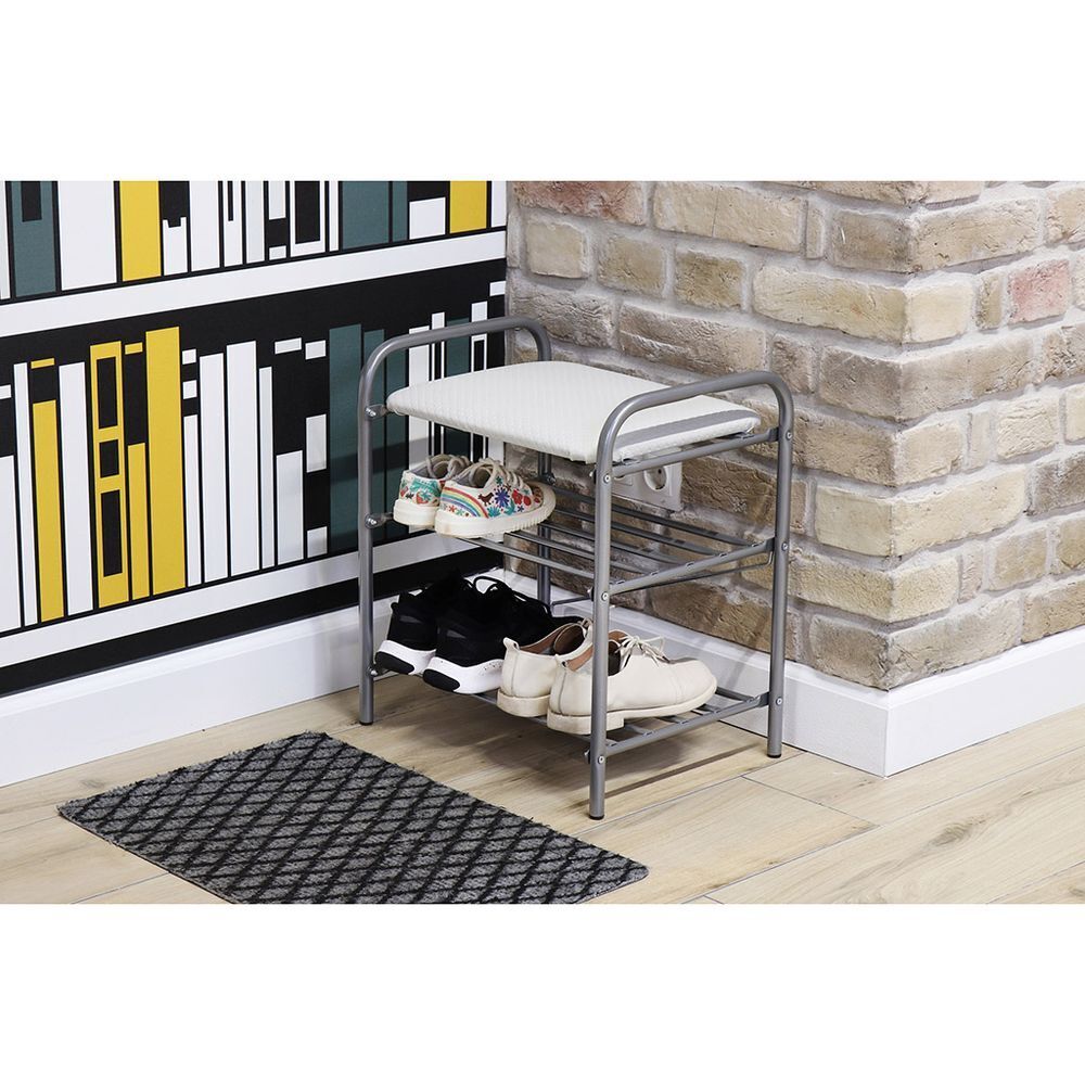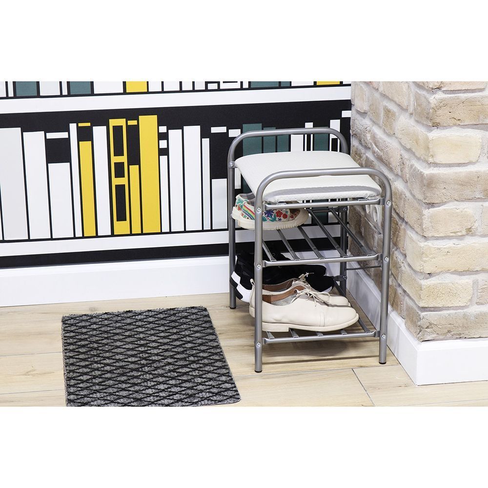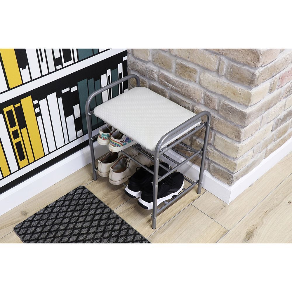 Металлический усиленный каркас. Сиденье выполнено из винилискожи. Две полки для размещения обуви. Пластиковые колпачки на ножках защищают поверхность пола от царапин. Сборка производится с использованием инструментов.