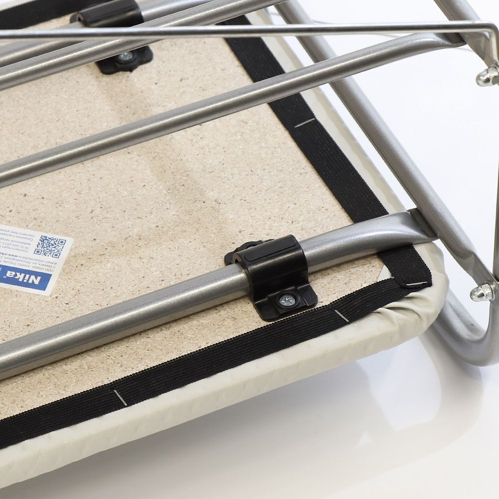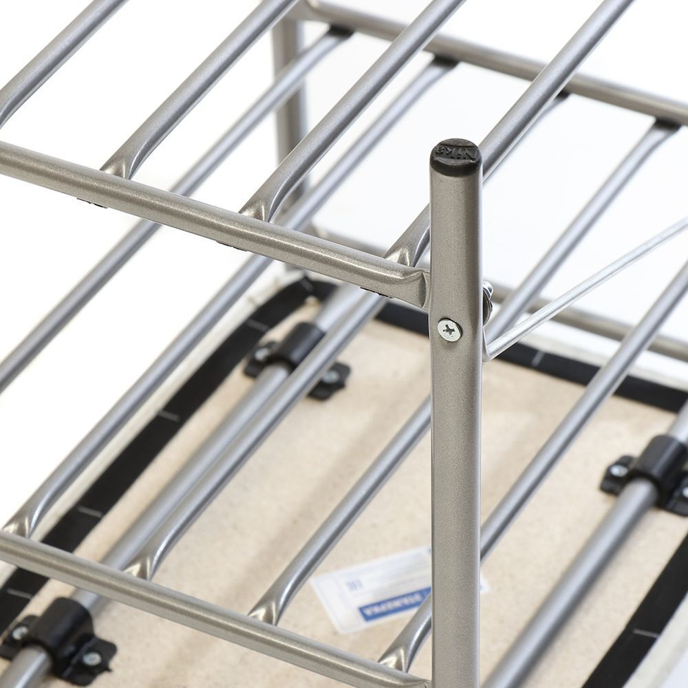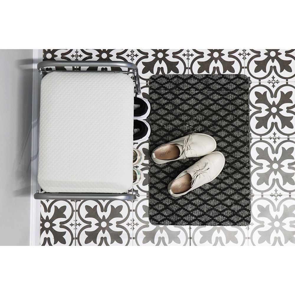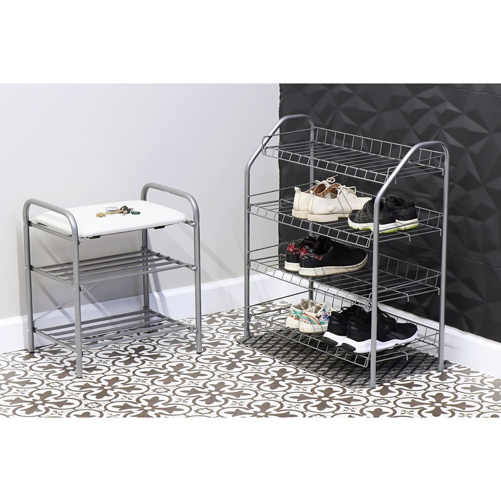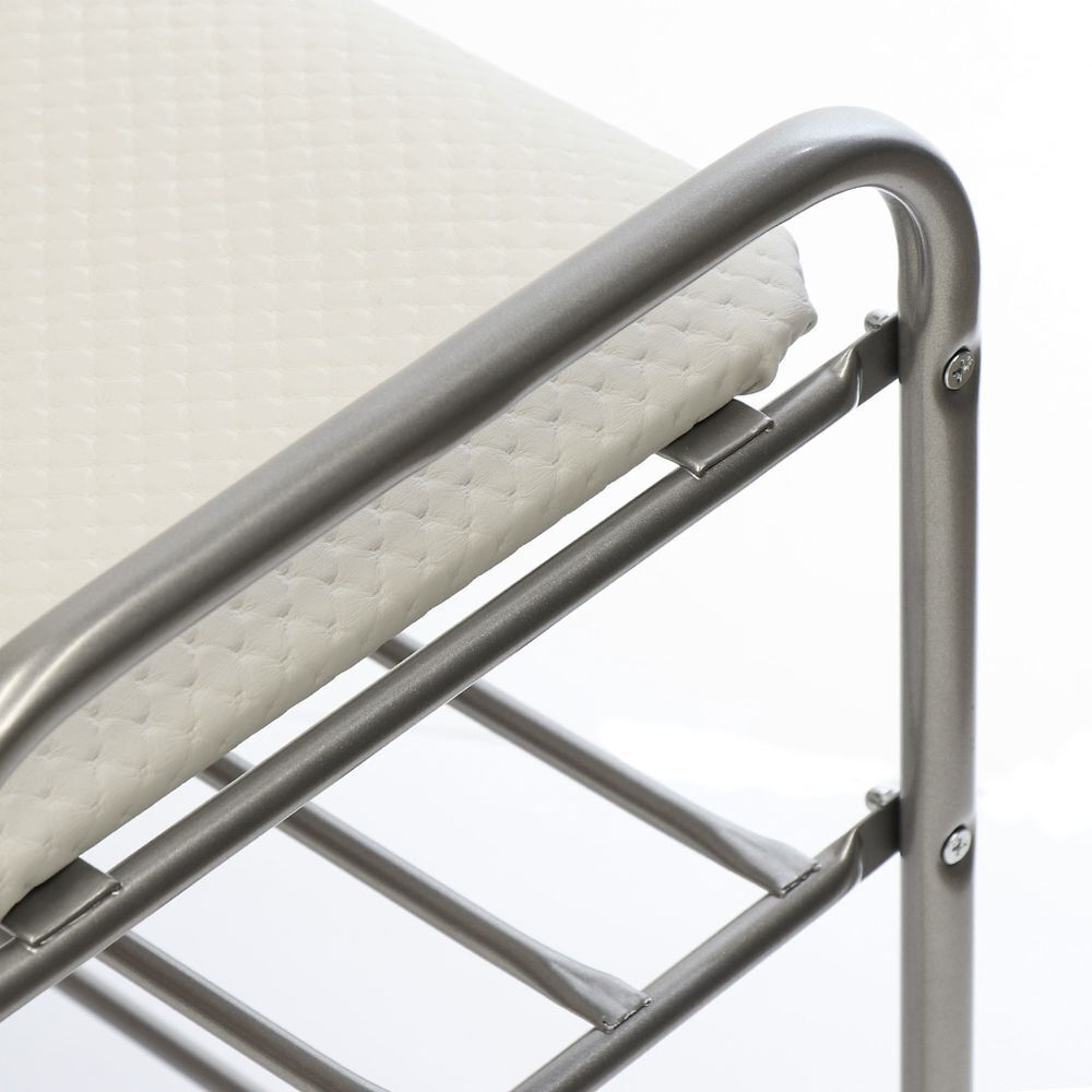 Металлический усиленный каркас. Сиденье выполнено из винилискожи. Две полки для размещения обуви. Пластиковые колпачки на ножках защищают поверхность пола от царапин. Сборка производится с использованием инструментов.