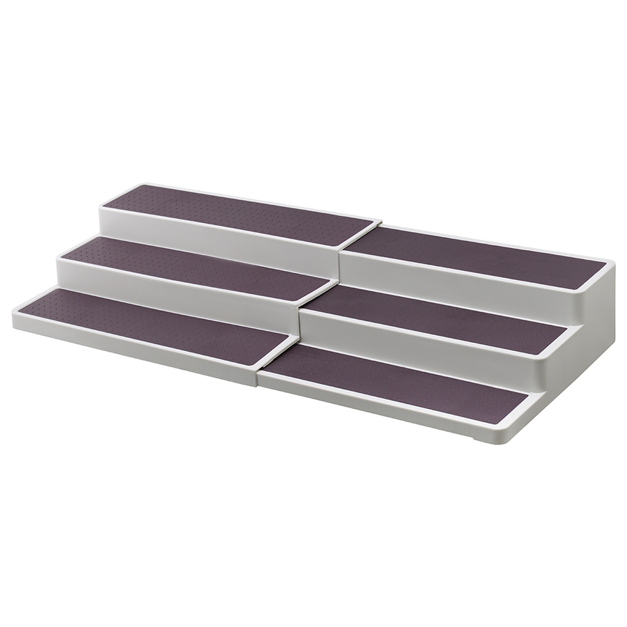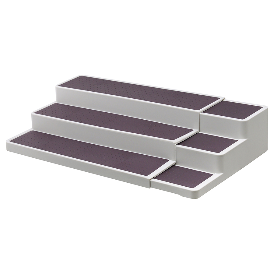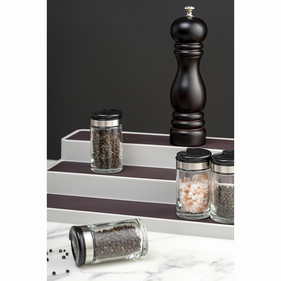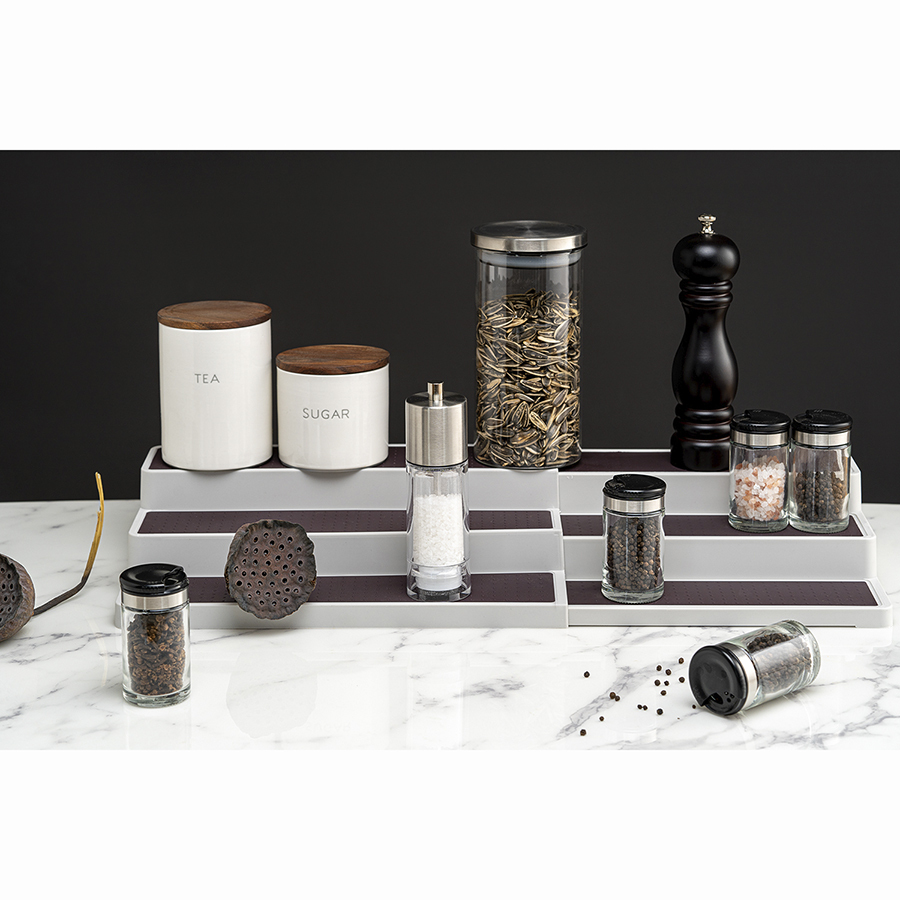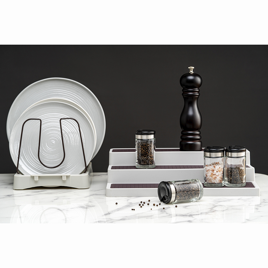 Полка Brage поможет организовать удобное хранение банок для специй и других кухонных аксессуаров. Трехъярусная раздвижная конструкция отличается хорошей вместительностью, при этом является компактной. Корпус из высокопрочного пластика гарантирует изделию надежность и долгий срок службы. Покрытие из термопластичной резины с противоскользящим эффектом обеспечивает прочную фиксацию предметов на полке.