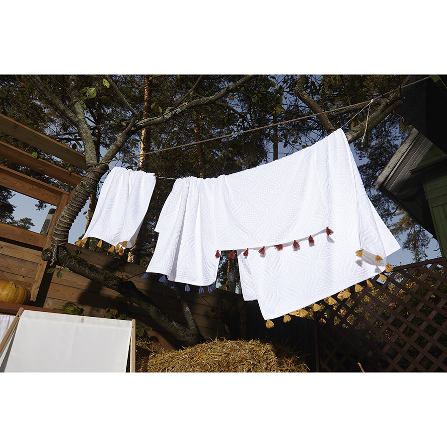 Полотенце для рук из коллекции Essential – качественный текстиль из экологичного хлопка, который идеально подойдет для ежедневного использования и украсит вашу ванную комнату. Мягкая, приятная на ощупь ткань превосходно впитывает влагу и дарит комфорт при контакте с кожей. Материал абсолютно гипоаллергенен, так как не содержит синтетических волокон, при этом обладает высокими показателями прочности и износостойкости. Дизайн полотенца вдохновлен этническими мотивами, что подчеркивают декоративные элементы в виде кисточек контрастного оттенка.