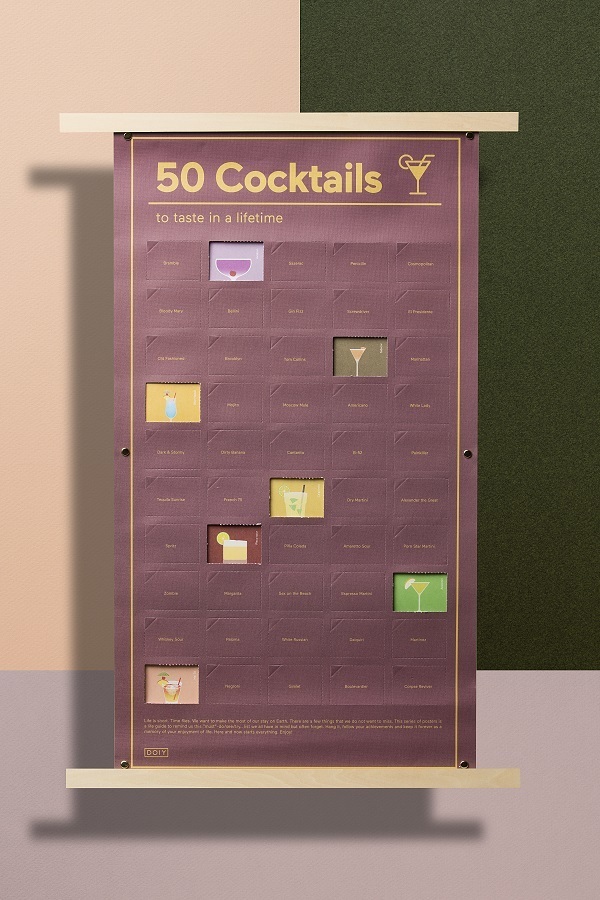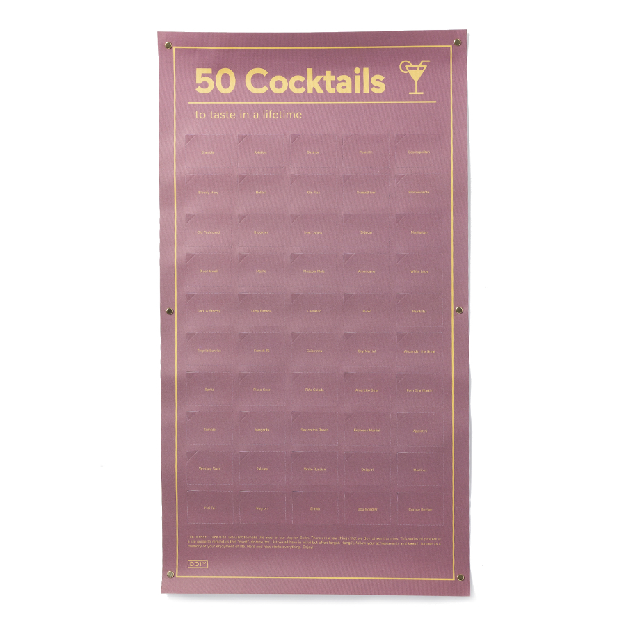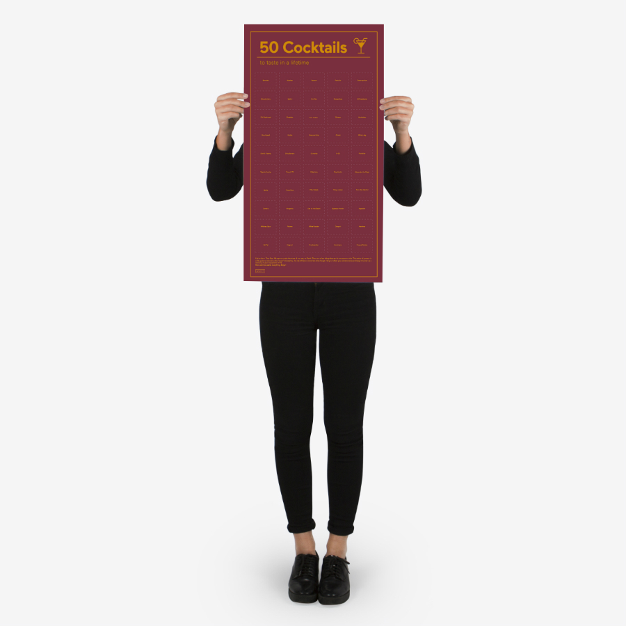 Дизайн: Постер «50 коктейлей, которые нужно попробовать в жизни» — забавный и полезный подарок для истинных гурманов спиртных напитков. В постере содержится полная информация о представленных в каждой ячейке коктейлях, способе приготовления и количестве входящих ингредиентов. Интересная идея для тех, кто не знает, что подарить друзьям на небольшое семейное торжество. Материал: бумага.
