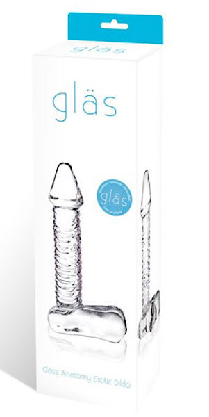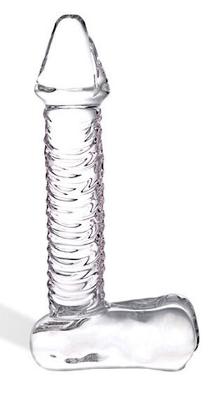 Фаллоимитатор из прозрачного стекла с рельефными венами на стволе, выполненный в розоватом оттенке. Длина фаллоса на платформе-мошонке: 17 см. Максимальный диаметр: 4,5 см.