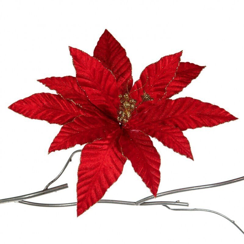 Искусственный цветок красной новогодней пуансеттиии для оформления праздника в классическом стиле. Украшение на елку, венок, гирлянду оформлено из дорогого текстиля и украшено глянцевыми пайетками. Крепится на ветку с помощью клипсы.