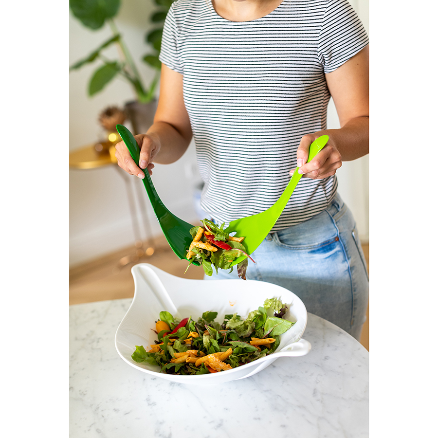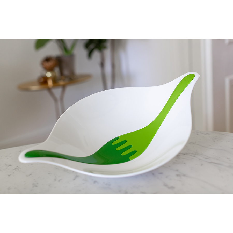 Салатник с приборами Leaf L+ – это универсальная посуда, которой вы можете сервировать стол для обеда или ужина, взять с собой на дачу или пикник. Глубокая и компактная емкость дополнена изогнутыми по форме ее чаши ложками для перемешивания салатов. Эту элегантную и стильную посуду можно мыть в посудомоечной машине.