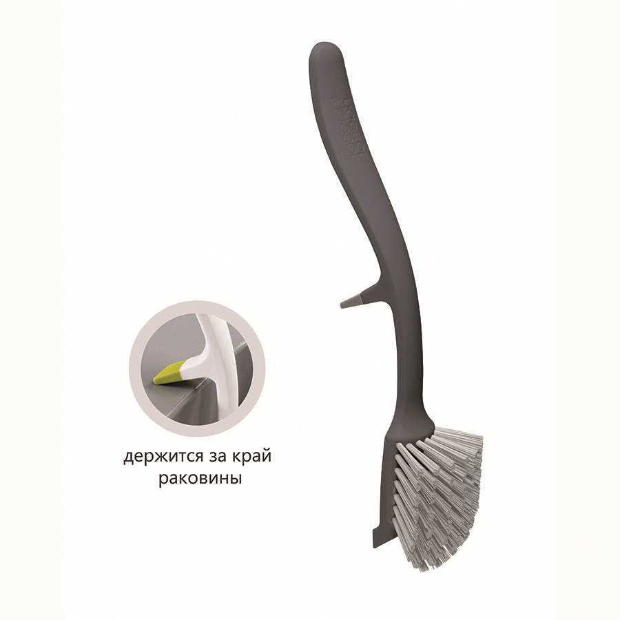 Щетка для мытья посуды позволит по максимуму использовать пространство вокруг раковины. За нескользящие крючки щетку можно подвешивать на внутренний край раковины: это не только экономит место, но и позволяет каплям воды аккуратно стекать прямо в слив. Щетка покрыта мягкой, не оставляющей царапин щетиной, изгибы которой позволяют тщательно очищать уголки подносов и блюд. Для крепко налипших остатков пищи предусмотрен специальный скребок.