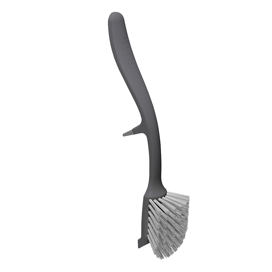 За нескользящие крючки щетку можно подвешивать на внутренний край раковины: это не только экономит место, но и позволяет каплям воды аккуратно стекать прямо в слив. Щетка покрыта мягкой, не оставляющей царапин щетиной, изгибы которой позволяют тщательно очищать уголки подносов и блюд. Для крепко налипших остатков пищи предусмотрен специальный скребок. Материал не содержит бисфенола-А.