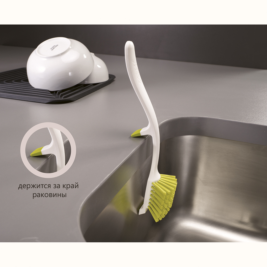 За нескользящие крючки щетку можно подвешивать на внутренний край раковины: это не только экономит место, но и позволяет каплям воды аккуратно стекать прямо в слив. Щетка покрыта мягкой, не оставляющей царапин щетиной, изгибы которой позволяют тщательно очищать уголки подносов и блюд. Для крепко налипших остатков пищи предусмотрен специальный скребок. Материал не содержит бисфенола-А.