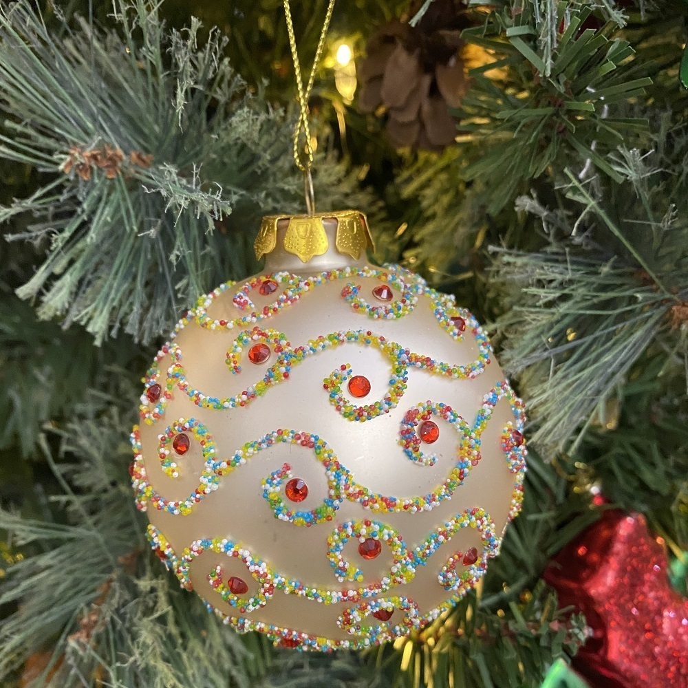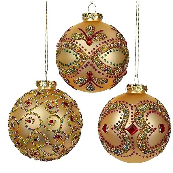 Шар золотой украшен блестящим декором с красными бусинами и стразами, напоминающими настоящие драгоценности. Ёлочные шары - непременный атрибут Нового Года.