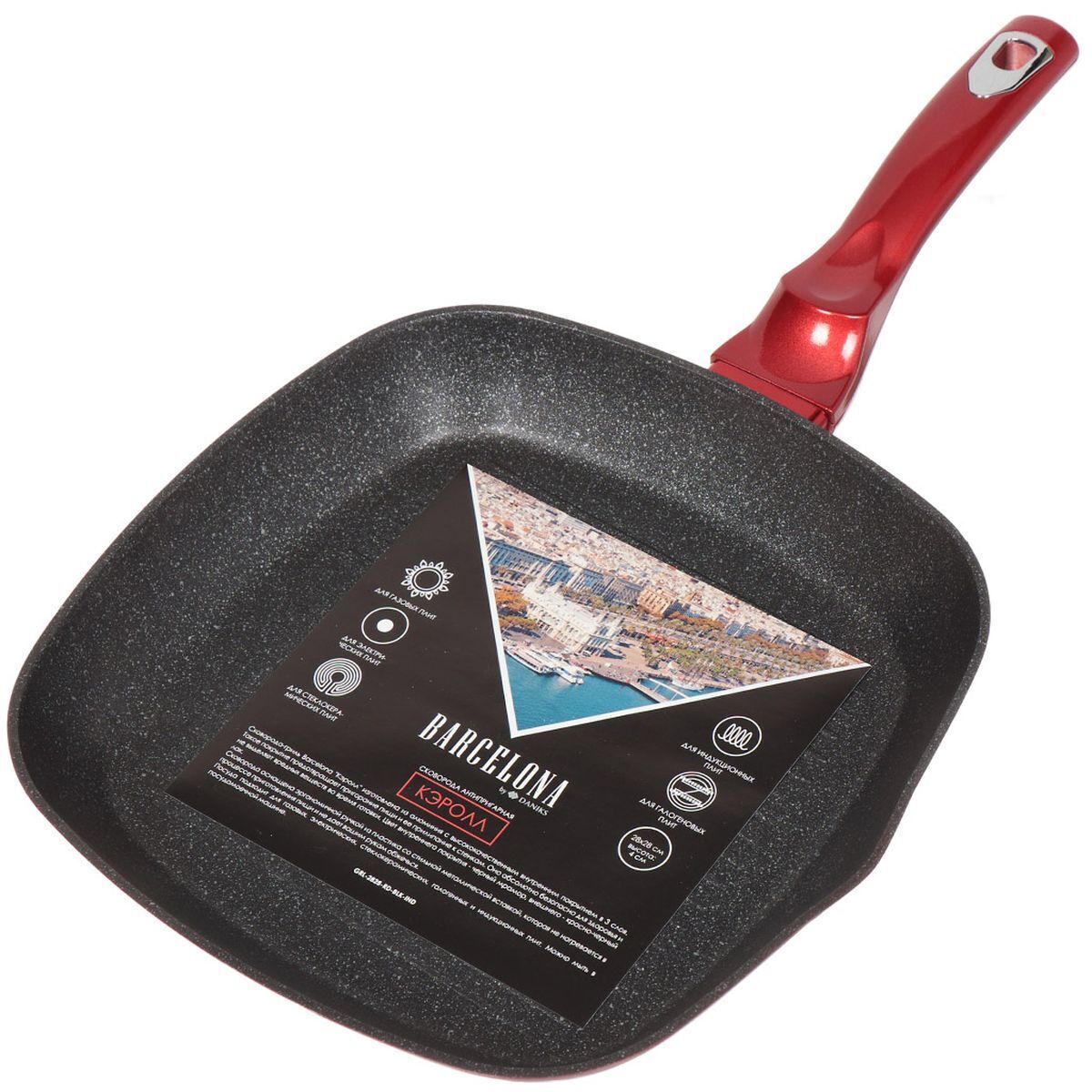 Сковорода-гриль Barcelona "Кэролл" изготовлена из алюминия с высококачественным внутренним покрытием в 3 слоя. Такое покрытие предотвращает пригорание пищи и ее прилипание к стенкам. Оно абсолютно безопасно для здоровья и не выделяет вредных веществ во время готовки. Цвет внутреннего покрытия - черный мрамор, внешнего - красно-черный лак.