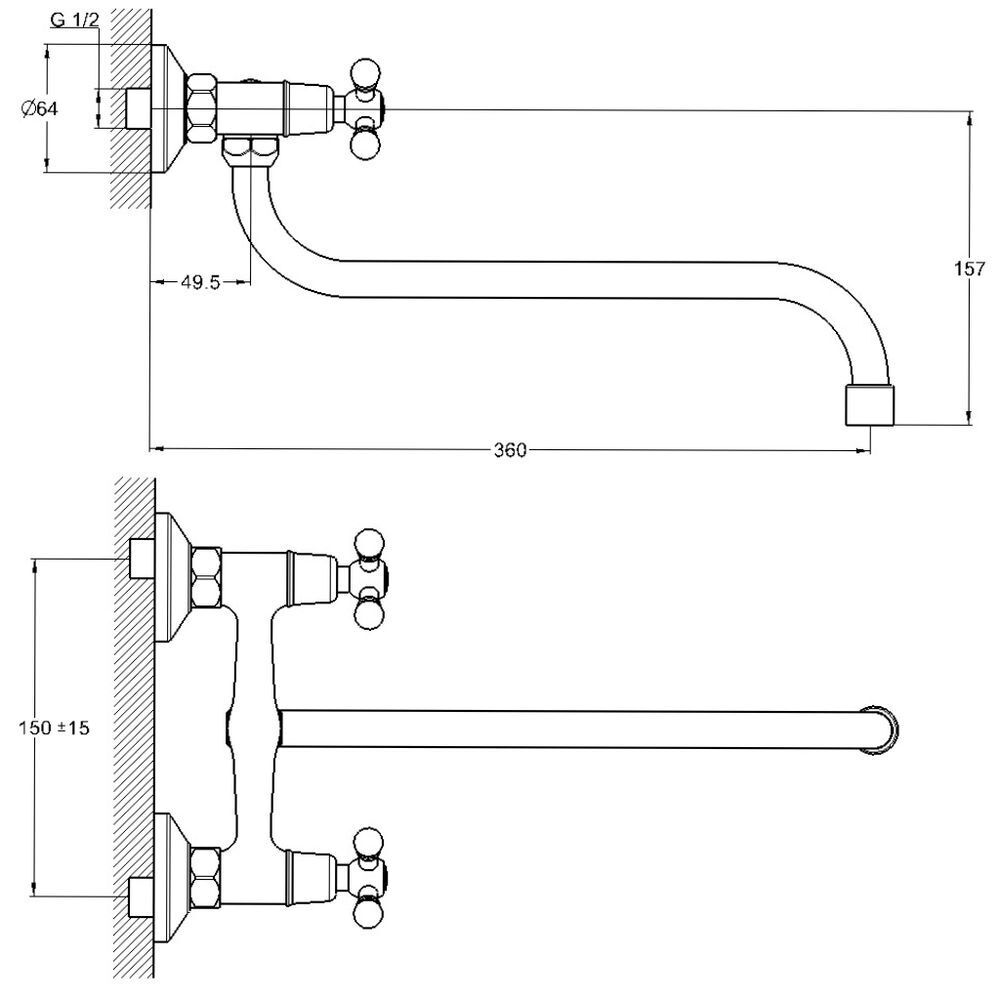 Смеситель монтируется на стену под два отверстия.