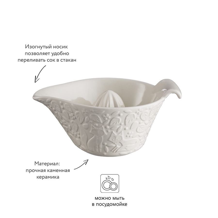 Ручная соковыжималка для цитрусовых In the Forest станет важной деталью на вашей кухне. Воодушевляясь народными сказками середины XIX века, дизайнеры украсили посуду этой коллекции тиснением в виде лесного пейзажа. Свежевыжатый сок собирается в емкость, а изогнутый носик позволяет удобно переливать жидкость в стакан. Девайс выполнен из качественной керамики, которая не впитывает запахи, цвет и сохраняет натуральный вкус напитка. Соковыжималку можно мыть вручную или в посудомоечной машине.