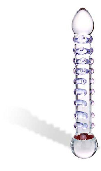 Классический жезл из прозрачного стекла с выпуклыми точками по всему стволу жезла. В круглой головке фаллоса - красный тропический цветок. Длина фаллоса: 21,5 см. Диаметр головок: 3,5 и 4 см.