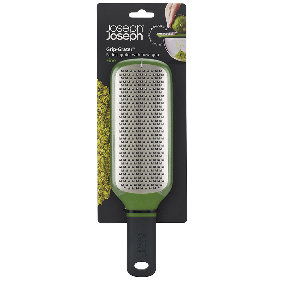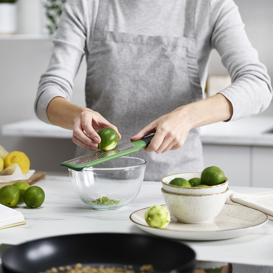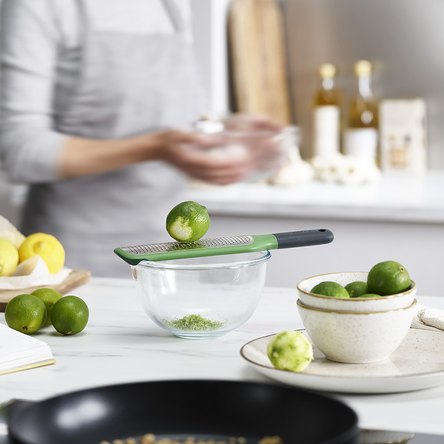 Терка оборудована грубым лезвием из нержавеющей стали, ручкой с удобным захватом, а также специальными насечками на нижней стороне, которые цепляются за край чаши и позволяют легко натирать продукты в миску. Материал не содержит Бисфенол-А.