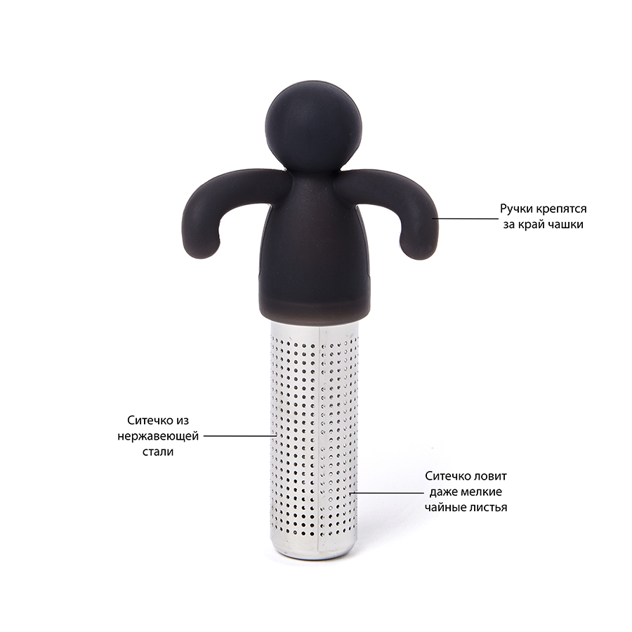 Заваривайте любимый чай сразу в кружке с помощью заварочника «Бадди». Такой забавный человечек развеселит Вас за завтраком и напоит ароматным чаем в считанные минуты его заварив. Благодаря мелкому сетчатому основанию чаинки не высыпятся, но чай получится насыщенным в считанные секунды. Зафиксировать заварник можно благодаря «ручкам» человечка, они легко гнутся в зависимости от формы кружки и прочно закрепляются на ее стенке. Идея и разработка ёмкости принадлежит известным дизайнерам Alan Wisniewski и Gil Cohen.