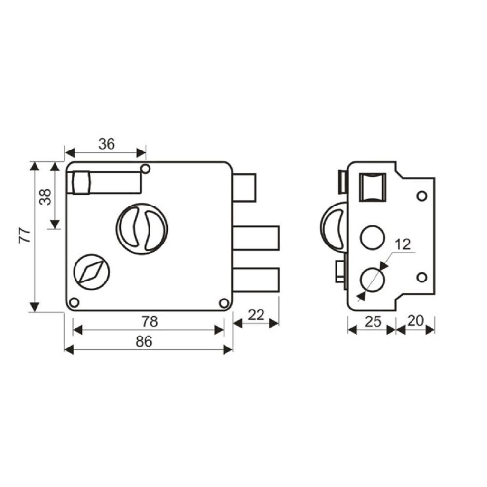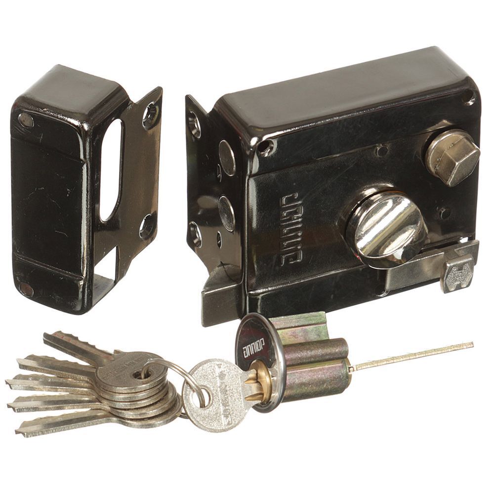 Замок накладной цилиндровый с вертушкой, фиксатором и защелкой. Предназначен для установки на деревянные двери. Засов из двух цилиндрических ригелей диаметром 12 мм, с максимальным вылетом 22 мм. Удаление ключевого отверстия - 50 мм. Габариты замка - 86х77х25 мм. Комплектация - 6 ключей, запорная планка, накладка. Механизм замка под англ.ключ, идет совместно с корпусом. Закрывание и открывание замка изнутри производится вертушкой, снаружи ключом.
