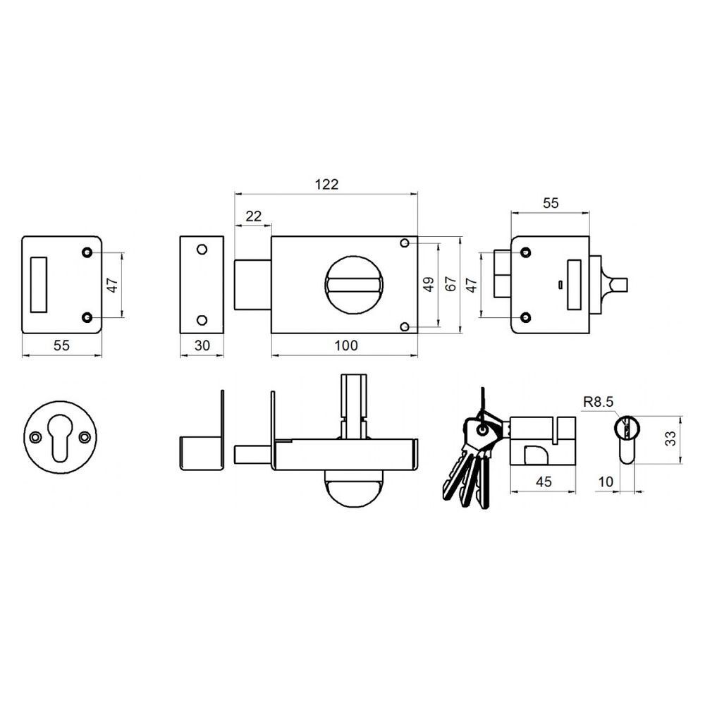 вылет засова: 22 мм