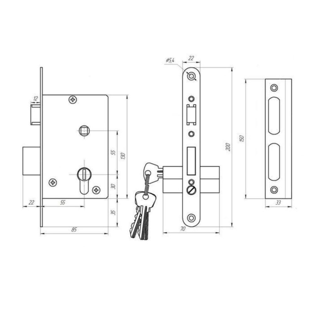 Комплектность: замок, цилиндровый механизм 70 мм, ответная планка, ручки РФ1-55, комплект крепежа