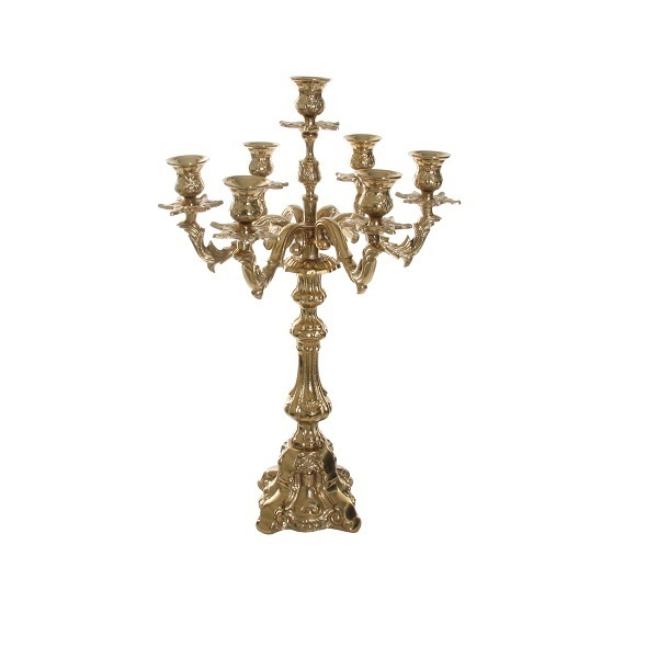 Классический канделябр на 7 свечей из качественного сплава, тёплого золотого оттенка. Резная форма канделябра и тонкие рожки, поддерживающие подсвечники - бутоны, сделаны вручную. Такой канделябр сможет украсить ваш интерьер и без свечи, а гладкая, глянцевая поверхность легко очищается и не ржавеет.