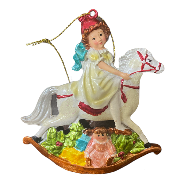 Взгляните на эту ёлочную игрушку: милая девочка Лили играет в отважную наездницу, оседлав свою любимую лошадь-качалку и совершенно позабыв про другие гостинцы, которые лежат возле нее. Белый конь с ухоженной гривой и длинным хвостом готов унести свою подругу в чудесные края и показать ей волшебные страны.