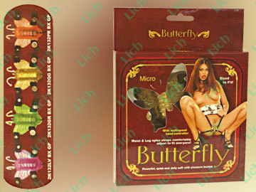 Клиторальный стимулятор *Бабочка* на эластичных ремешках для крепления к телу. Бабочка выполнена из силикона золотистого цвета, ее размеры: длина тела 5 см, размах крылышек 4,5 см.. Вибрация может плавно изменяться благодаря выносным пульту управления вибрацией. Доставит удовольствия Вашему клитору и Вам.