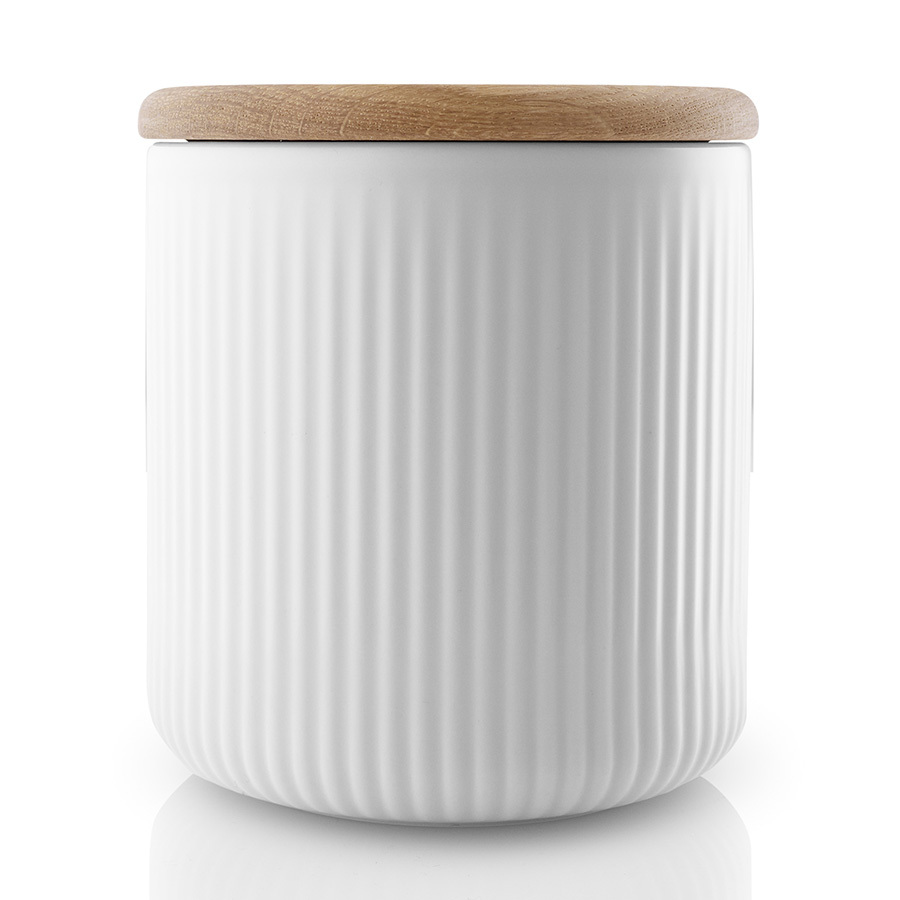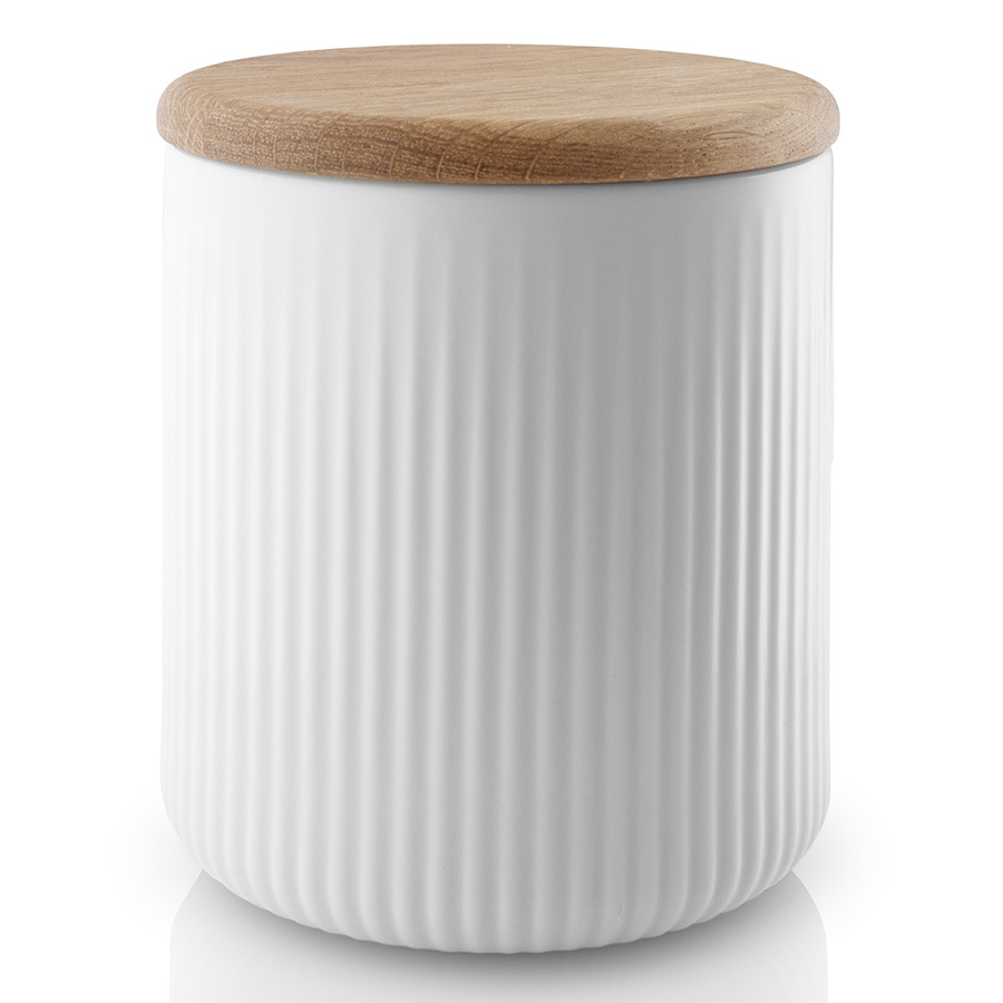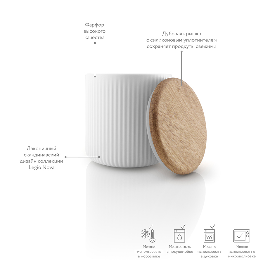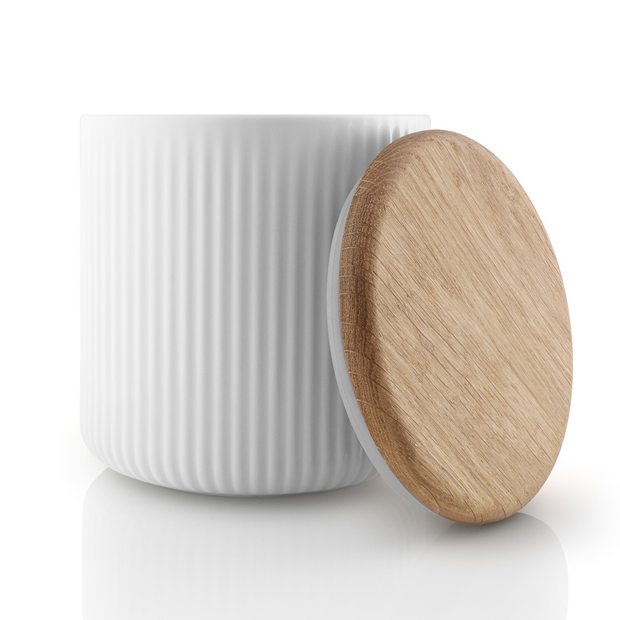 Аксессуар выполнен из высококачественного фарфора белого цвета. Банка снабжена дубовой крышкой с силиконовым уплотнителем. Благодаря этому продукты сохранят вкус и будут защищены от влаги.