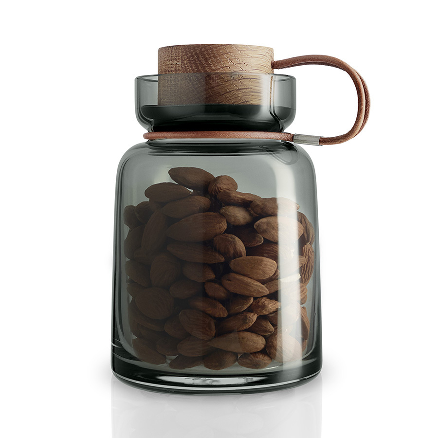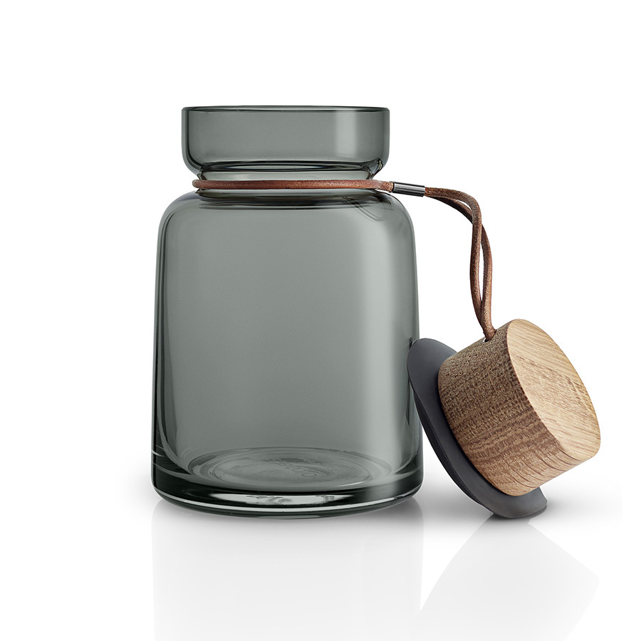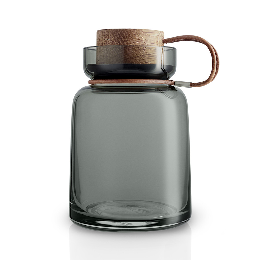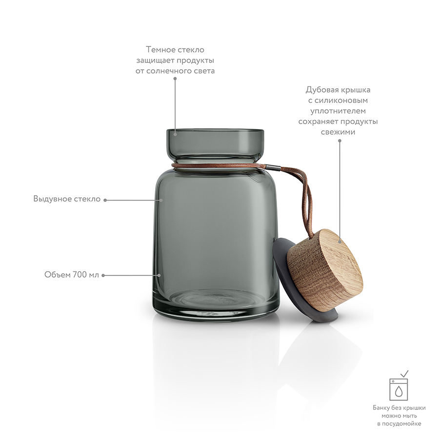 Банка выполнена из дымчатого выдувного стекла, которое защищает содержимое от солнечного света, сохраняя ароматы и цвета. Изделие оснащено удобной, плотно закрывающейся дубовой пробкой, которая прикреплена к горлышку с помощью кожаного ремешка.