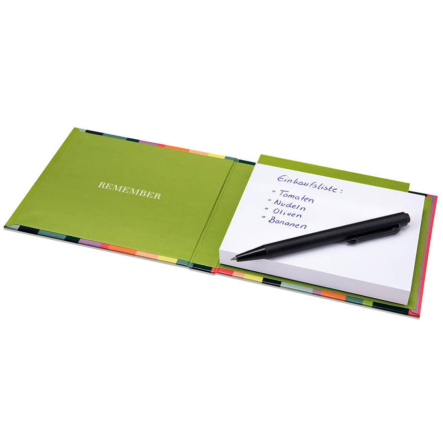 В комплект входят яркий блокнот с 200 отрывными стикерами и шариковой ручкой. Компактный блокнот помещается в любую сумку. Размеры: 11 х 9,5 х 1,5 см.