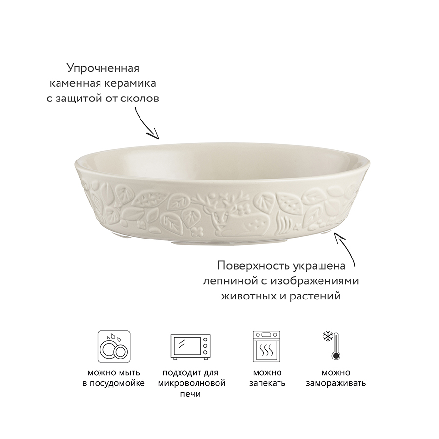 Блюдо для запекания In the Forest займет достойное место на домашней или профессиональной кухне. При создании посуды этой коллекции дизайнеры вдохновились пейзажами осеннего леса. Поверхность блюда украшают листья и животные, нанесенные в виде лепнины.