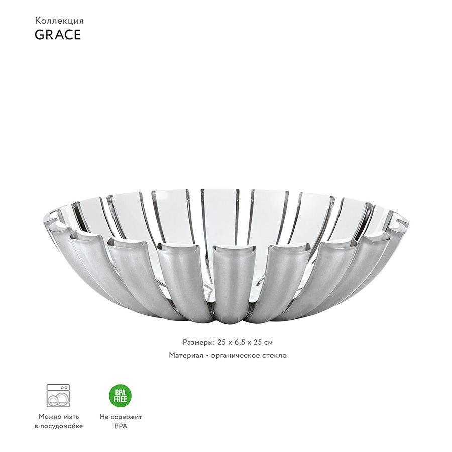 Глубокое блюдо Grace отличается необычной формой, в которой внешние рельефные края контрастируют с белоснежной внутренней поверхностью. Такой оригинальный дизайн точно привлечет внимание гостей, тем более, что эффект объемного цвета усиливается на свету. Универсальное по характеру, блюдо отлично исполнит роль вазы для фруктов или хлебницы для пикника. Его также можно использовать в качестве предмета декора для создания яркого акцента в жилом помещении или на улице. Диаметр - 25 см. Материал - органическое стекло. Можно мыть в посудомоечной машине.