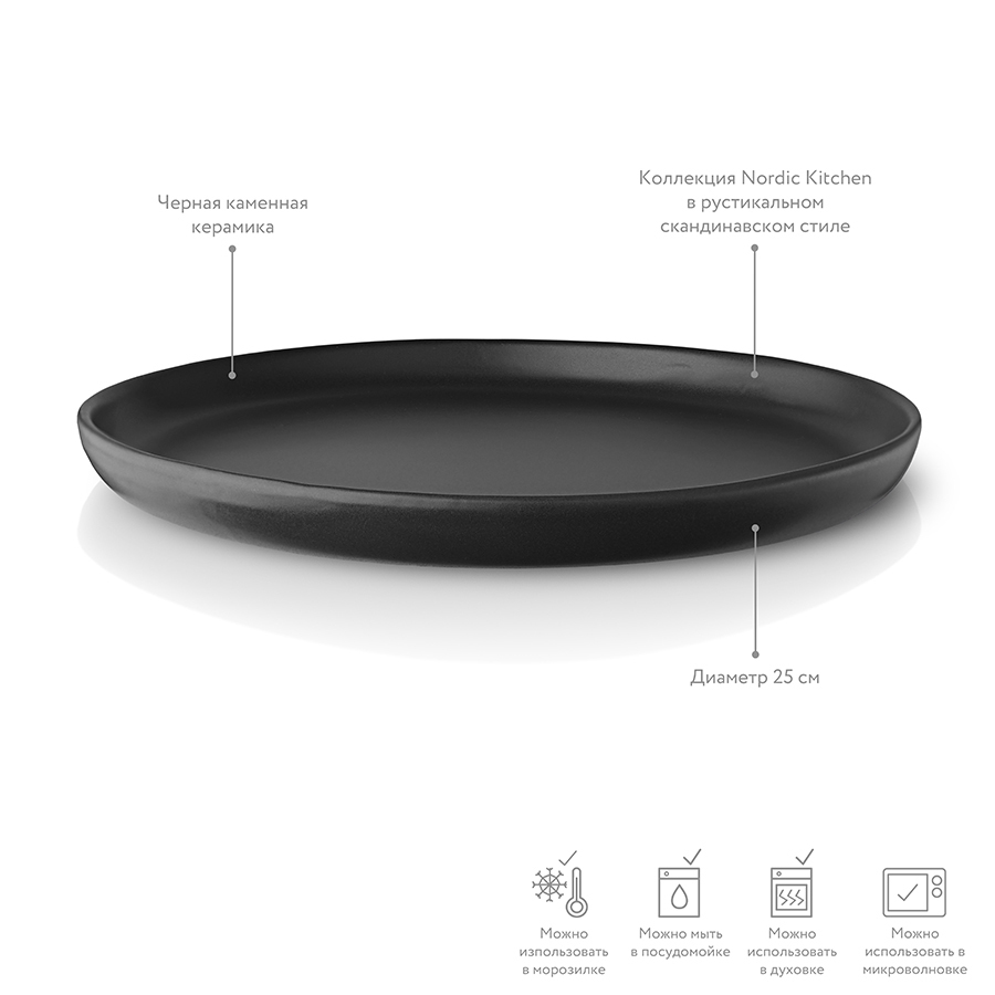 Минималистичный дизайн и высокая функциональность составляют суть скандинавского дизайна. Коллекция предметов сервировки Nordic kitchen воплотила все черты скандинавской эстетики. Простой выверенный дизайн черной каменной керамики в рустикальном скандинавском стиле. На тарелке с плоским дном и закруглёнными бортиками удобно сервировать основные блюда. Благодаря большому диаметру её легко использовать в качесвте сервировочного блюда для подачи сыров, фруктов или тортов. Чёрное матовое покрытие подчёркивает яркие цвета соусов, фруктов, овощей и зелени. Тарелку можно использовать в духовке, морозильной камере, микроволновой печи и мыть в посудомоечной машине.