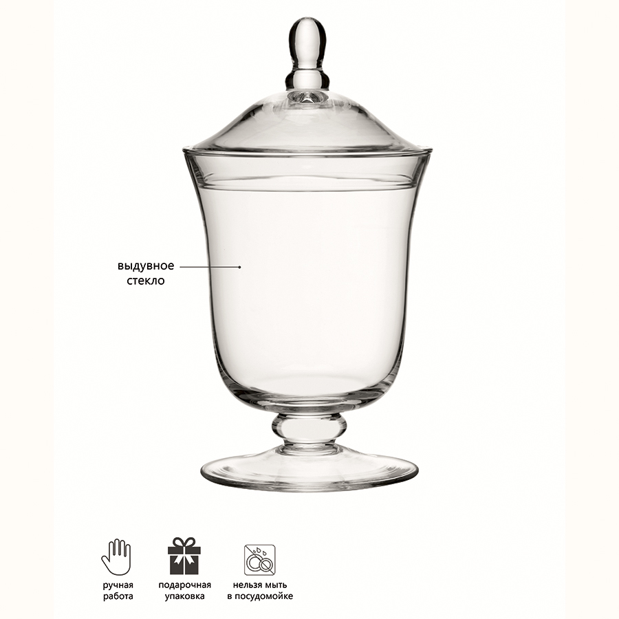 Бонбоньерка отлично подойдет для хранения леденцов, ирисок, конфет, печенья, бисквитов и хлопьев.Изящная и милая вещь, которая добавит уюта любой кухне и придется по душе всем, кто любит устраивать домашние вечеринки. Мелкие пузырьки внутри выдувного стекла не являются браком (круглые пузырьки < 3 мм и овальные пузырьки < 5 мм): это допустимые индивидуальные особенности изделий, изготовленных вручную.
