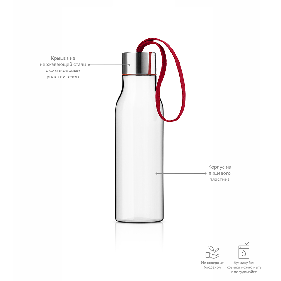 Небольшая пластиковая бутылка объемом 0,5 л прекрасно подойдет для прогулок пешком или на велосипеде, а также для занятий спортом. Благодаря силиконовому ремешку бутылку удобно переносить в руках, а герметично закрывающаяся крышка не позволяет жидкости разлиться, если бутылка находится в сумке. Модель выполнена из качественного ударопрочного пластика, в составе которого отсутствуют вредоносные примеси, такие как фталаты и бисфенол-А. Бутылка подходит для мытья в посудомоечной машине, крышку рекомендуется мыть вручную.