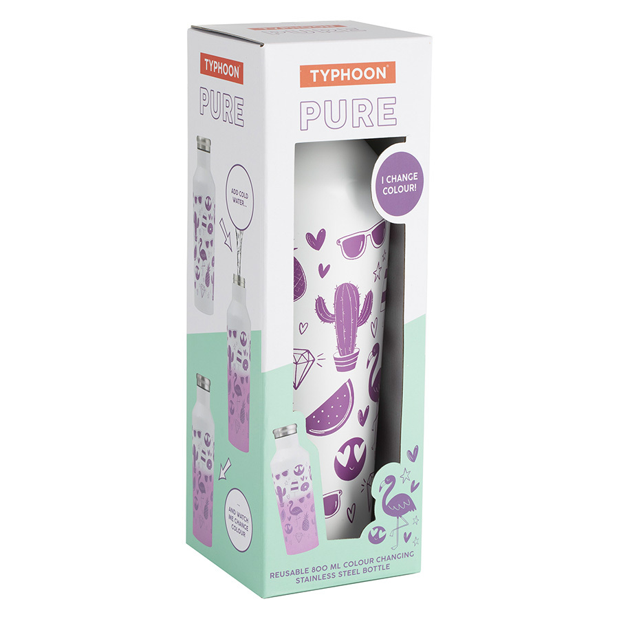 Бутылка меняет цвет: при температуре ниже 18 °C она становится розовой, а при температуре выше 18 °C — белой. Широкое горлышко из нержавеющей стали позволяет класть в бутылку кубики льда. Объем: 800 мл.