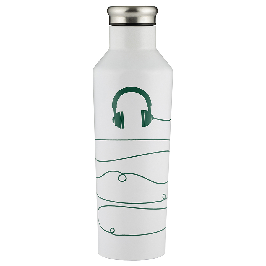 Бутылка меняет цвет: при температуре ниже 18 °C она становится зеленой, а при температуре выше 18 °C — белой. Широкое горлышко из нержавеющей стали позволяет класть в бутылку кубики льда. Объем: 800 мл.