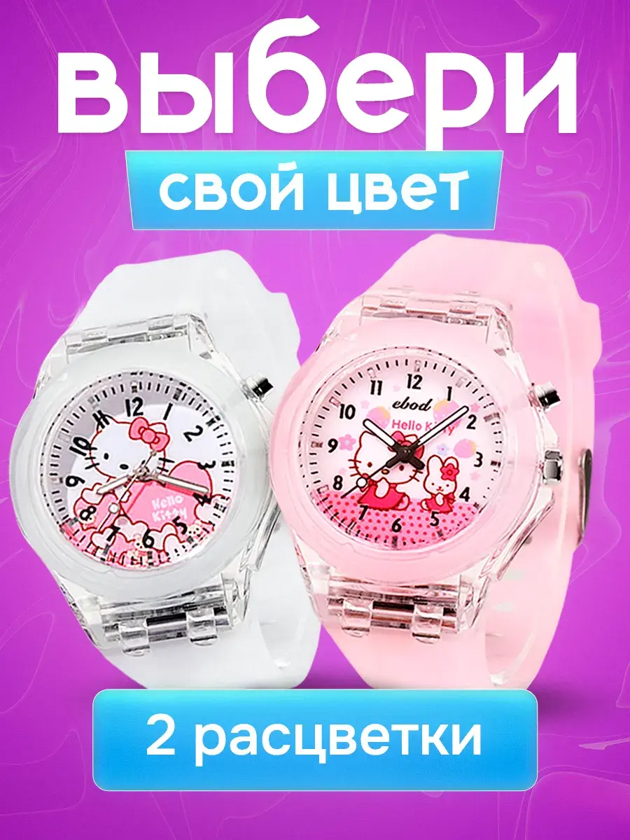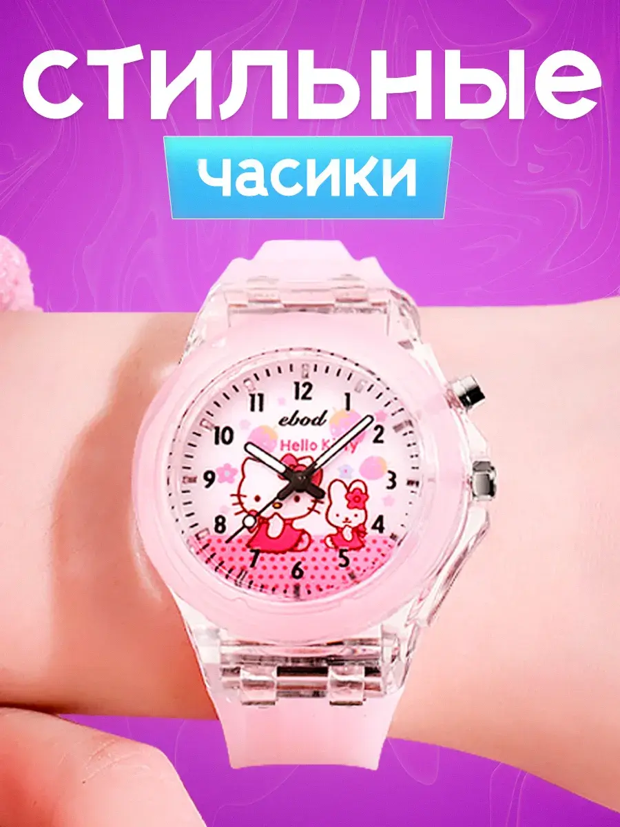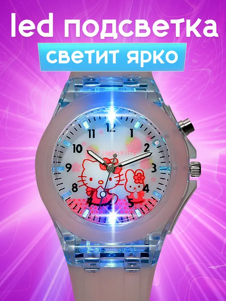 Яркие детские наручные часы - модный аксессуар для девочек с важным функциональным предназначением. Благодаря наличию такого типа часов ребенок научится смотреть слушать тик так распознавать время планировать свои дела. Учебные ходики на руку кварцевые не электронные на батарейках представлены с рисунком – любимые герои из мультиков мимимишные мордашки Хелло Китти. Красивые со стрелками с качественным механизмом прочным гипоаллергенным силиконовым браслетом - классика которая всегда в тренде. Стильные модные пластиковые часики и ремешки оснащены LED - подсветкой как ручные украшения подходят для ежедневной носки. Если знакомство с часами для ребенка еще рано малыши оценят их как игрушка светящаяся в темноте. Диаметр циферблата с арабскими цифрами защищен прочным акриловым стеклом, а ремень с регулируемой по длине застежкой обеспечивает комфортное ношение исключая их потерю идеально для школьников подростков занятий спортом бег велосипед фитнес. Корпус детских часов для девочки круглой формы мигает переливается разными цветами, картинки hello kitty не оставят равнодушными самых маленьких и старше. Наличие минутной секундной стрелок пробуждает интерес к течению времени. Прозрачные светодиодные часики дети с радостью возьмут с собой в детский сад школу во двор на прогулку уличные обычные игры создав модный образ. Спортивные можно использовать как походные для туризма – большой экран крупные цифры делают использование легким приятным. Отличный подарок от бренда DinoShop подростку дочке сестре внучке на любой праздник года день рождения первый юбилей и др. В наборе идет подарочная коробка для создания праздничной обстановки. Качественная стильная вещь станет любимым аксессуаром малышки.