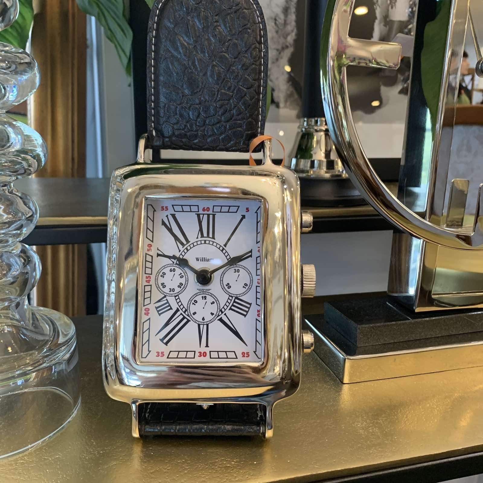 Эти часы как будто сняли с сильной мужской руки и поместили на каминную полку в Вашей гостиной. Металлическийй корпус полностью имитирует наручные часы, на белом циферблате легко различаются римские цифры.