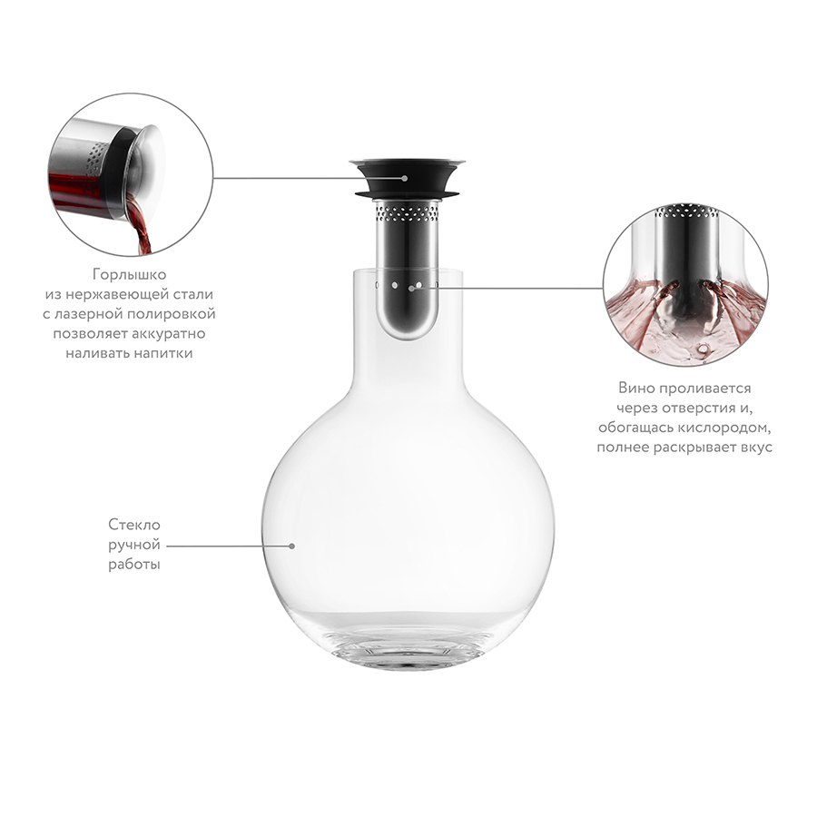 Мойка в посудомоечной машине: да Графин-декантер, который выявит лучшее в выбранном вами вине. При наливании вино проходит через внутреннюю воронку со множеством дырочек, а потом стекает по стенкам, что позволяет ему максимально обогатиться кислородом. Этот процесс одновременно раскрывает вкус вина и позволяет любюоваться им. Он также продолжается в самом декантере благодаря большому диаметру. Помимо этого, когда вы будете наливать вино в бокал, ни капли не прольется мимо - специальная форма горлышка не позволяет каплям падать с него, вместо этого направляя их обратно в графин. Изделие выдувается вручную и вмещает 0,75 л.