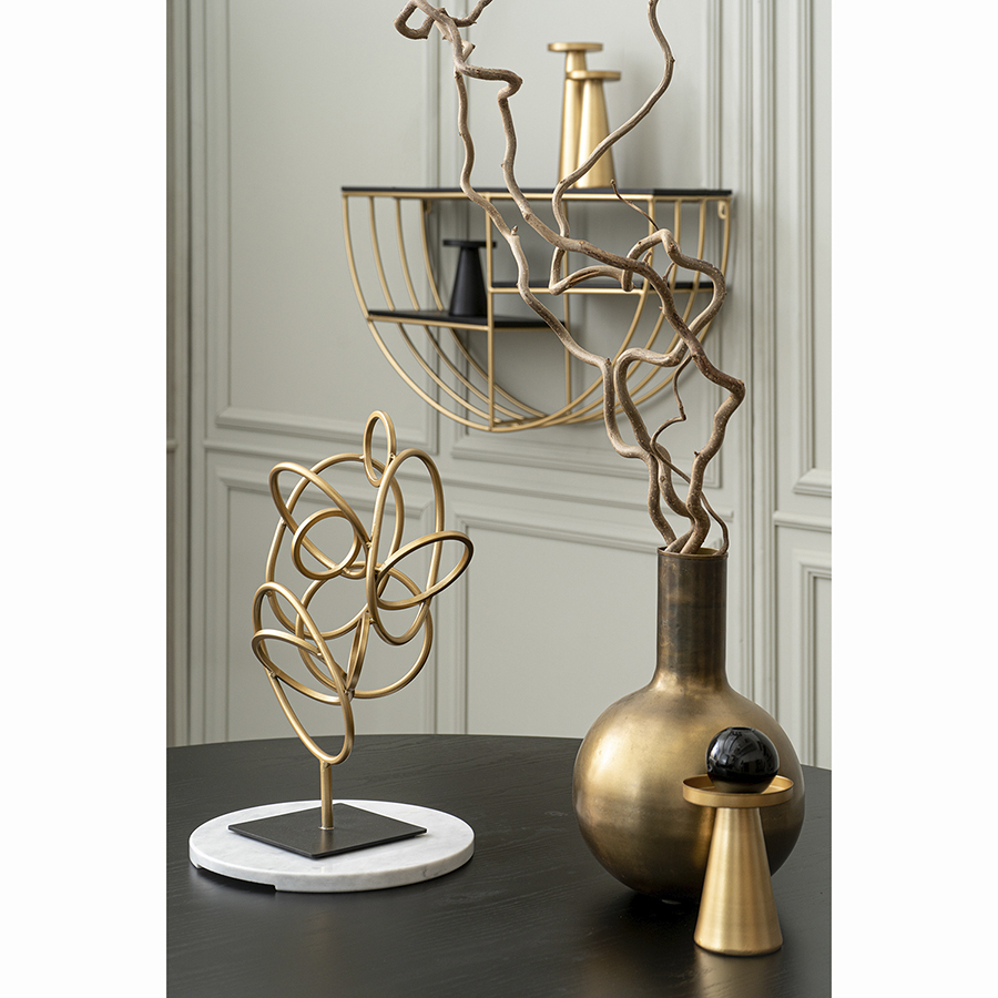 Изделие выполнено из окрашенного железа, что обеспечивает ему отличные износостойкие характеристики, такие как практичность и долговечность. Устойчивое основание исключает случайное падение. Необычные геометрические формы обеспечивают в интерьере красивый визуальный эффект, а элементы теплого оттенка латуни добавляют в оформление нотки уюта и благородства.