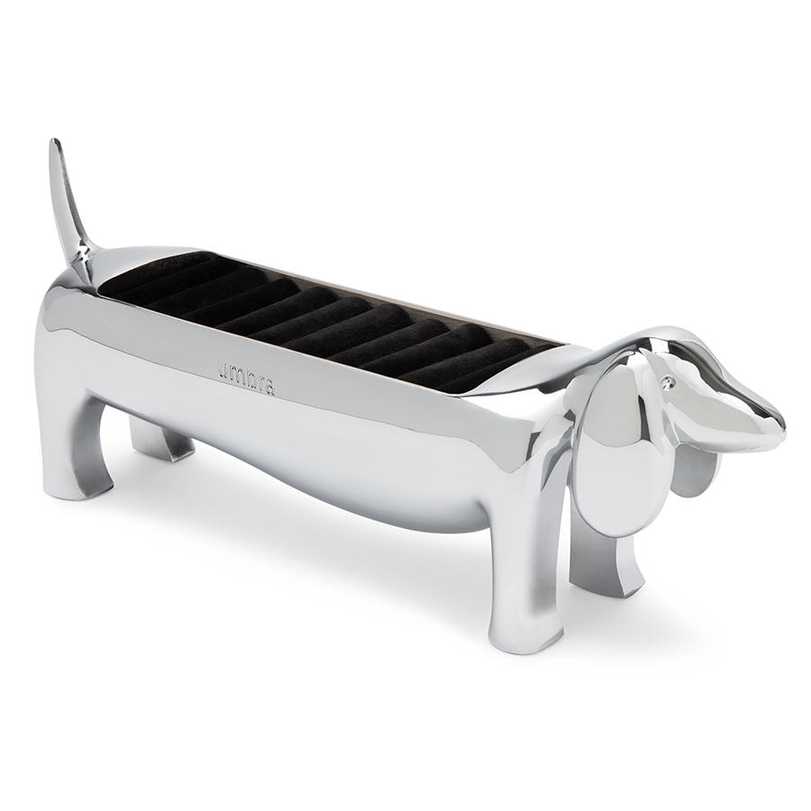 Держатель для украшений Dachsie выполнен в виде таксы. Изделие позволяет хранить любимые кольца и перстни в одном месте. Его можно поставить на комод, прикроватную тумбочку или стол.