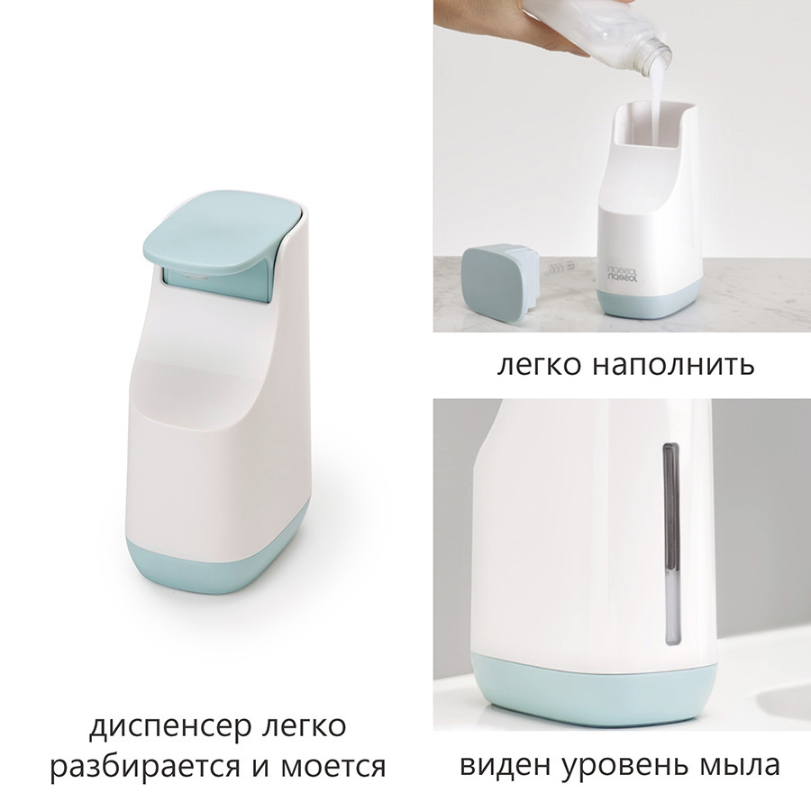 Стильный и компактный диспенсер для жидкого мыла поможет сохранить место вокруг раковины. Широкая помпа легко нажимается, дозатор рассчитан на оптимальное количество мыла на каждый раз. На корпусе диспенсера предусмотрен выступ для капель и шкала для своевременного пополнения мыла. Диспенсер оснащен специальными силиконовыми ножками, которые придают ему дополнительную устойчивость на гладких поверхностях. Он легко разбирается и моется. Общий объём: 350 мл. Диспенсер отлично подойдет для ванной в современном стиле, его можно комбинировать с другими аксессуарами из коллекции Joseph Joseph. Ванная — одна из наиболее сложных для уборки комнат. Здесь вопрос экономии места особенно актуален. Для создания новых аксессуаров дизайнеры Joseph Joseph руководствовались принципами рационального использования пространства, эргономичностью и удобством сортировки.
