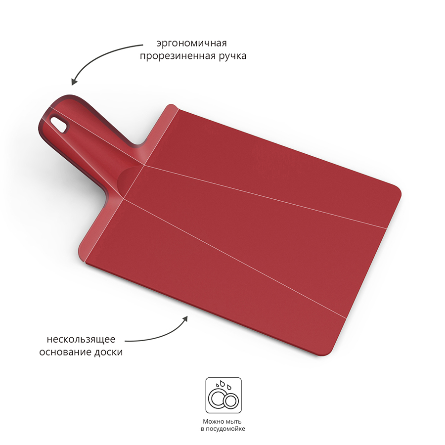Специальное покрытие защитит ваши ножи от повреждений. Ручка с прорезиненными концами создает максимальный комфорт при использовании. Всем знакомо, как неудобно сыпать порезанные овощи в кастрюлю. Одним движением разделочная доска превращается в удобный "совок", и все нарезанные продукты попадут прямо в миску.