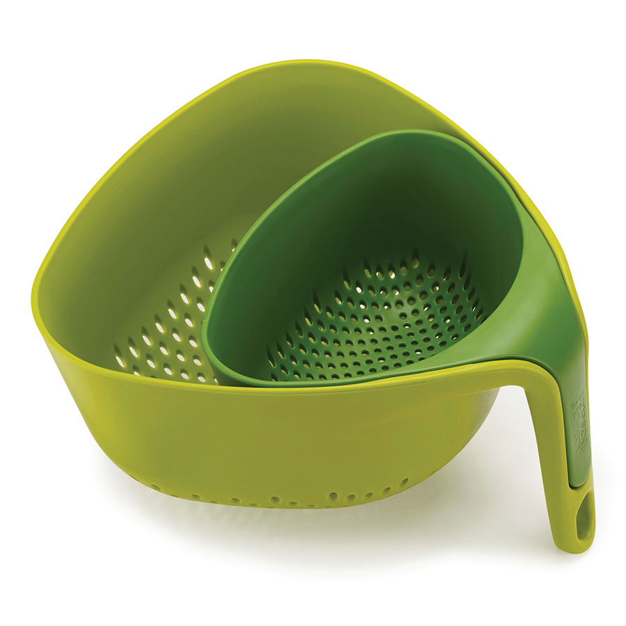 В каждый комплект входят два дуршлага разных размеров, которые вставляются друг в друга для компактного хранения. Эргономичная вертикальная ручка обеспечивает устойчивость на ровных поверхностях (стол, раковина, полка). Дуршлаг удобно держать одной рукой. Дуршлаги выполнены из пластика и идеально подходят для мытья ягод, фруктов, овощей и зелени. Модель представлена в сером и зелёном цветах. Дуршлаги входят в коллекцию посуды Nest от Joseph Joseph.