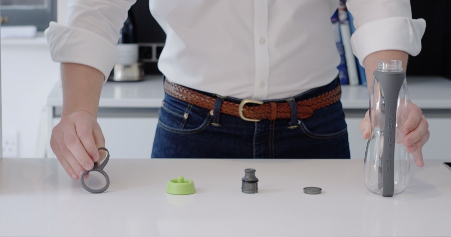 Материалом для бутылки служит экологически безопасный тритан, искусно имитирующий стекло, но гораздо более прочный и устойчивый к царапинам. Крышка из натуральной пробки снизу покрыта мягким силиконом и фиксируется к корпусу при помощи стального зажима, украшенного цветной матерчатой лентой для переноски. В корпусе имеется специальное углубление для фирменного угольного фильтра Binchotan, который входит в комплект.