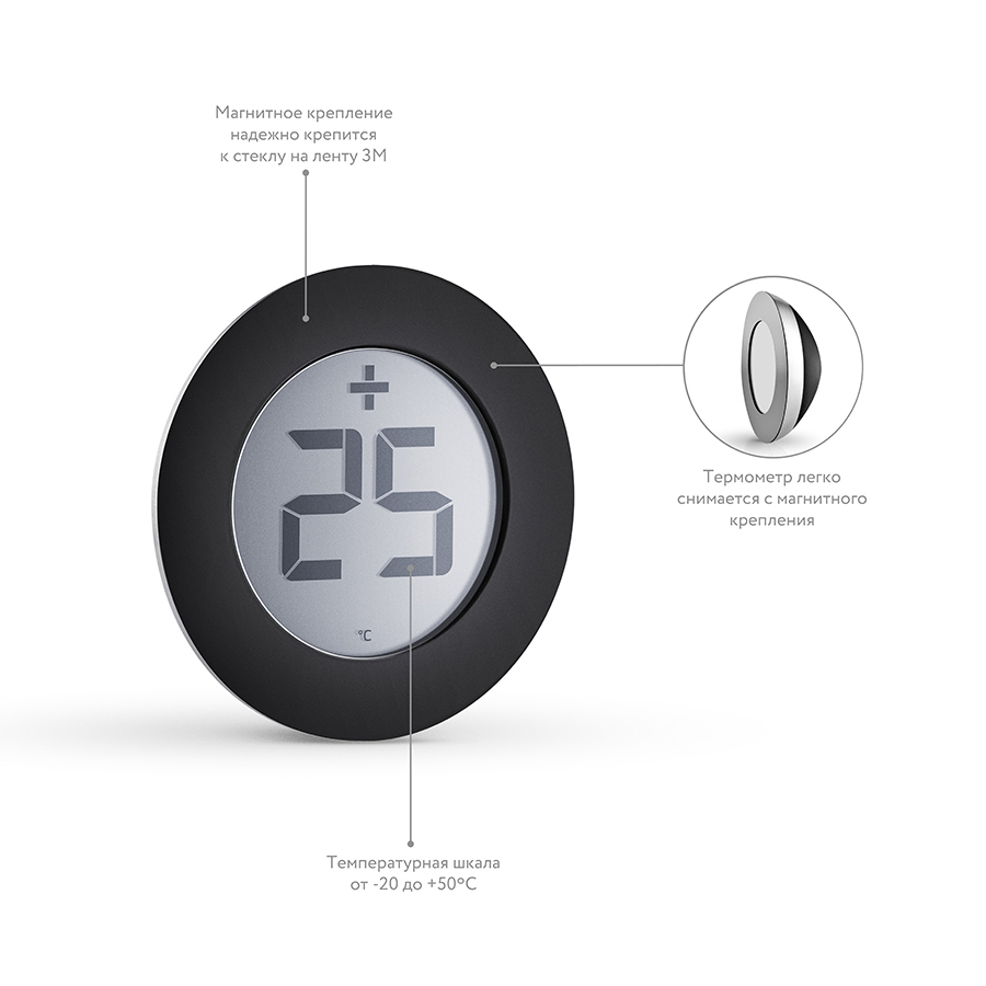 Если каждое утро вы сомневаетесь, чьему прогнозу довериться сегодня: Гидрометцентра, Гисметео или приложения в вашем смартфоне, установите современный термометр, который сообщит самую точную температуру на улице. Термометр Eva Solo работает от двух стандартных батареек AAA (не входят в комплект). Он быстро реагирует на изменение температуры и выдаёт самую актуальную информацию. Цифры на эго экране достаточно крупные, чтобы их без труда можно было прочитать даже через замёрзшее стекло. Термометр крепится на оконное стекло с внешней стороны на клейкую часть ободка вокруг экрана. Диаметр 85 мм. Стильный современный гаджет от датских дизайнеров. Температурная шкала от -20 до +50