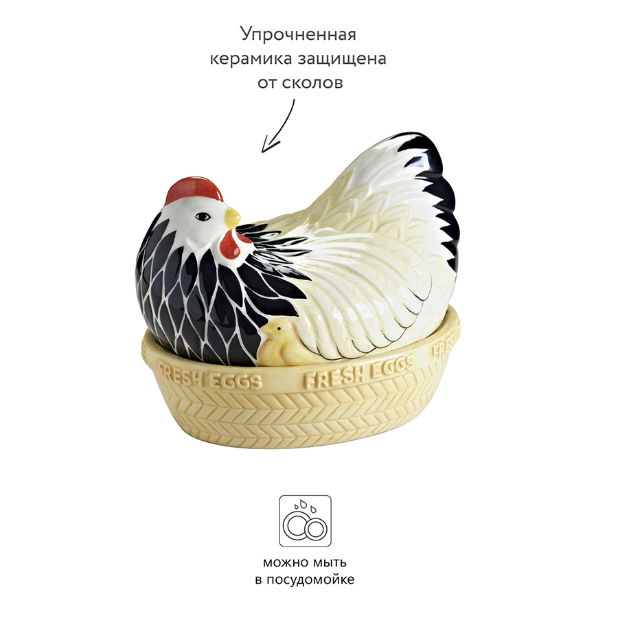 Оригинальная подставка для яиц Mother гармонично впишется в интерьер любой кухни. Дизайнеры создали аксессуар, воодушевляясь красотой британских фермерских дворов. Емкость в виде курицы на гнезде предназначена для хранения свежих яиц. Помимо этого подставка подходит для подачи фруктов, овощей и других продуктов.