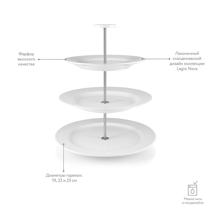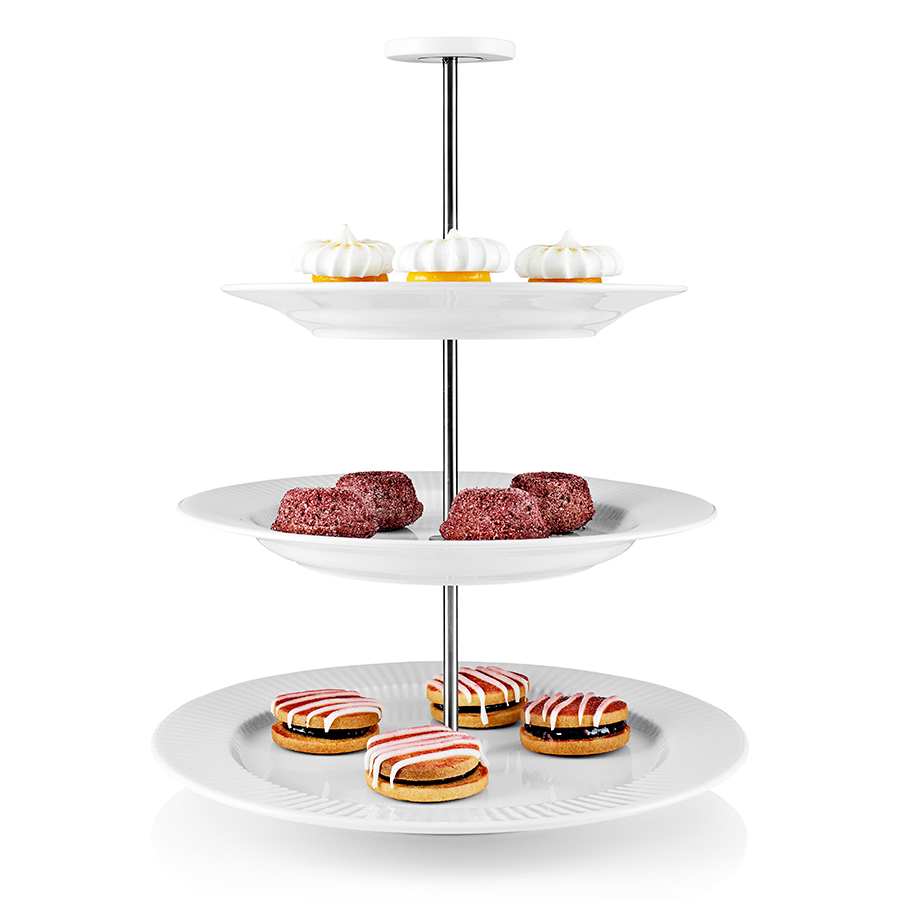 Классическая трехъярусная этажерка для изысканной сервировки небольших пирожных, сендвичей, фруктов и сладостей. Диаметр нижнего яруса составляет 25 см, средний и верхний ярусы – 22 и 19 соответственно. Модель выполнена из прочного белого фарфора, поэтому подходит для мытья в посудомоечной машине. Этажерка легко разбирается для компактного хранения.