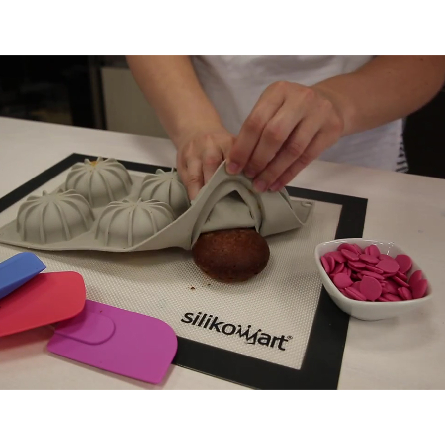 Дополнительная рамка придает десерту округлую форму. Форма выдерживает температуру от - 60 до + 230 °С. Силикон не содержит вредный бисфенол-А и соответствует европейским стандартам качества. Он не имеет запаха и не дымится во время готовки. Материал гибкий, прочный, устойчивый к перепадам температур. Форма выдерживает до 3000 использований. Перед использованием необходимо смазать изделие маслом. Диаметр ячейки: 6,8 см, объем: 88 мл.