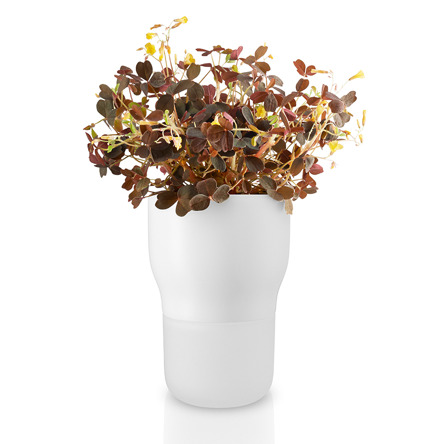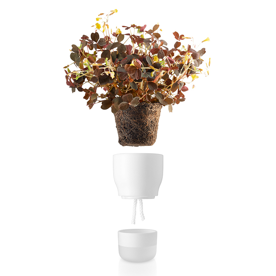 Горшок с функцией самополива сохраняет свежесть комнатных растений и ароматных трав, не требуя траты времени на постоянный полив и уход. Влага попадает к корням растений через нейлоновый шнур из нижнего резервуара с водой. Просто налейте в резервуар побольше воды и спокойно уезжайте в отпуск. Растения сами заберут столько влаги, сколько им потребуется. Горшок легко чистить и при необходимости можно мыть в посудомоечной машине. Диаметр 9 см
