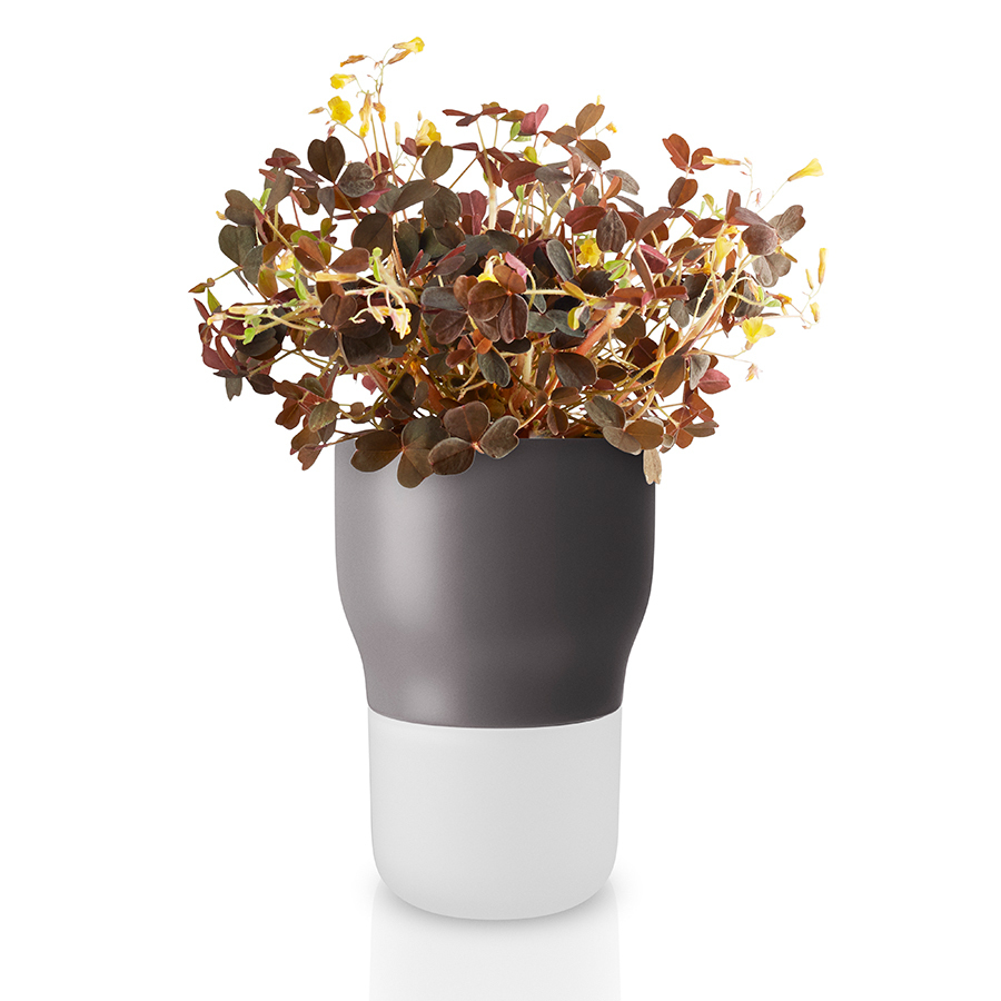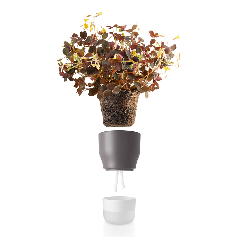 Горшок с функцией самополива сохраняет свежесть комнатных растений и ароматных трав, не требуя траты времени на постоянный полив и уход. Влага попадает к корням растений через нейлоновый шнур из нижнего резервуара с водой. Просто налейте в резервуар побольше воды и спокойно уезжайте в отпуск. Растения сами заберут столько влаги, сколько им потребуется. Горшок легко чистить и при необходимости можно мыть в посудомоечной машине. Диаметр 9 см